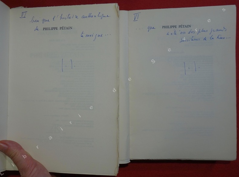 Edition originale. Un des 40 exemplaires numérotés sur pur fil, seul grand papier. Celui-ci est l'un des 10 exemplaires hors-commerce sur ce papier. Intéressant envoi autographe signé de l'auteur se poursuivant sur les pages de garde de chaque volume : "Bien que l'histoire authentique de Philippe Pétain témoigne ... Que Philippe Pétain a été un des plus grands serviteurs de la France." L'auteur n'a pas cru bon de nommé le dédicataire.