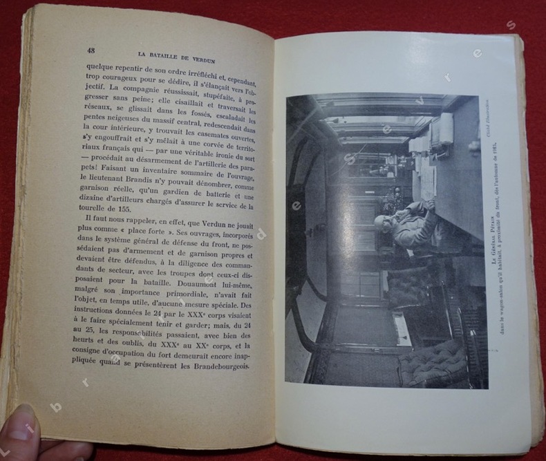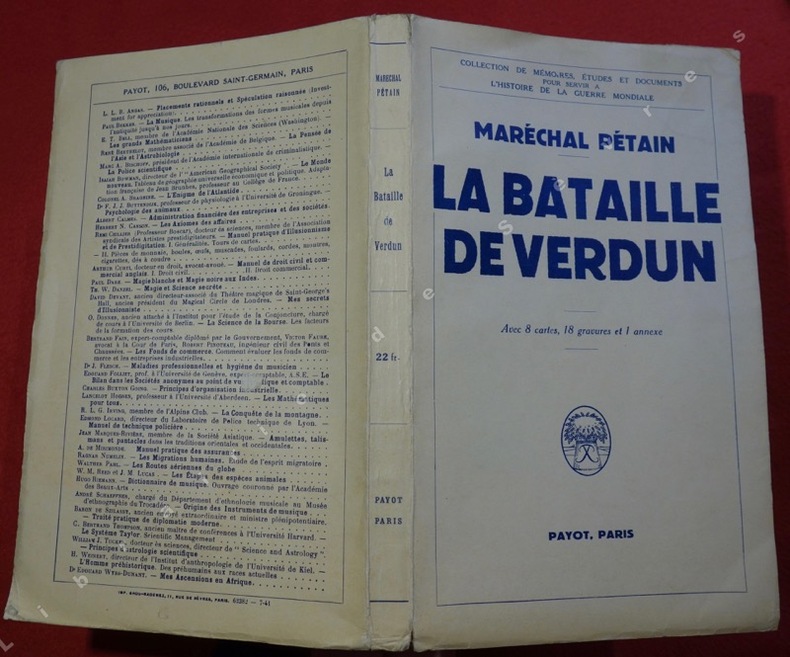 Le 21 février 1916, 1000 canons et 152 lance-mines déclenchent le plus formidable bombardement d'artillerie jamais vu dans l'histoire de l'homme. En quelques heures, un million d'obus nivelle les positions françaises, des miliers de soldats français sont morts ou agonisent, les autres attendent la fin avec résignation. L'infanterie allemande monte à l'assaut. Mais l'Armée française résiste. La bataille de Verdun racontée, en 1929, avec sobriété par le principal artisan de la victoire dans la célèbre collection Payot avec 8 cartes, 18 gravures et 1 annexe. ˮCeux qui crurent pouvoir le juger de 1940 à 1944 ne comprirent pas qu'à cette époque il fut aussi grand qu'à Verdun. Il faudra qu'un jours - bientôt - ses cendres reposent à Douaumont.ˮ Ouvrage du premier tirage de février 1929 établi dans une sobre mais agréable reliure en demi-basane marron (premier plat de couv conservé), dos à quatre nerfs avec pièces de titre et auteur, en bon état (mors très légèrement frottés). Intérieur bien propre (tranches très légèrement salies).