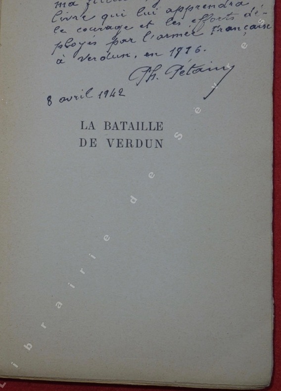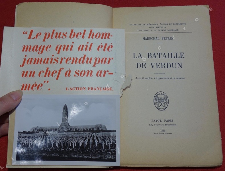 Exemplaire du 5e tirage, d'aout 1941. Contient 8 cartes et 18 reproductions en noir et blanc de photographies et documents, et 1 annexe. Exceptionnel envoi manuscrit de 6 lignes de l'auteur, signé et daté du 8 avril 1942. Il est joint une carte postale en noir et blanc de l'ossuaire de Douaumont, oblitérée du 25 février 1954.
