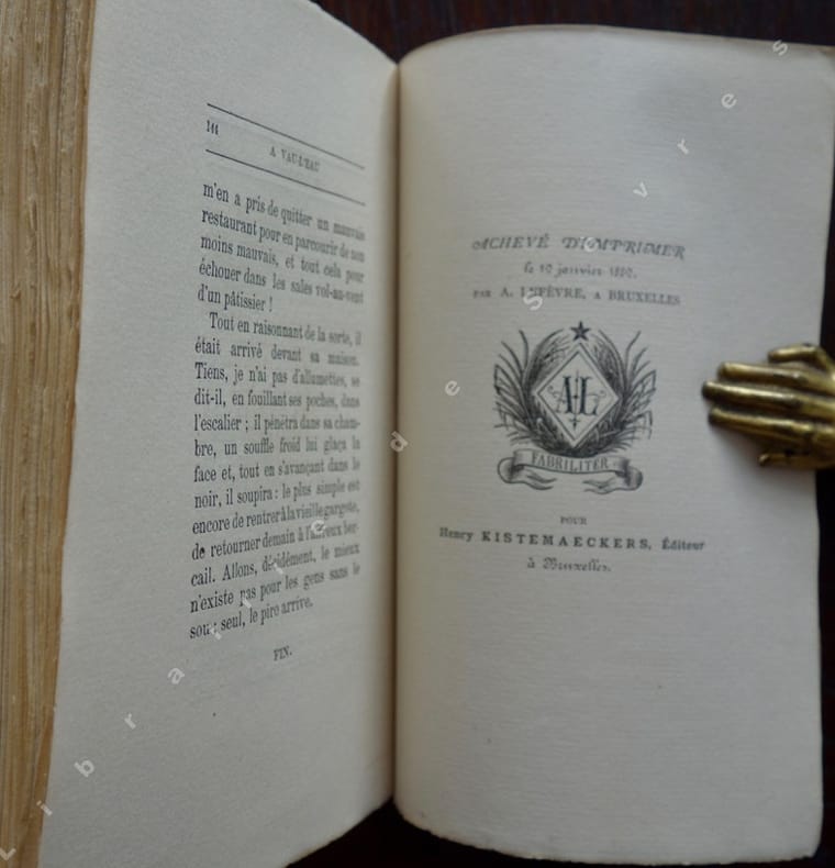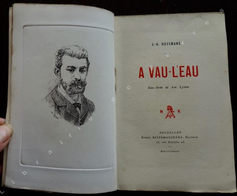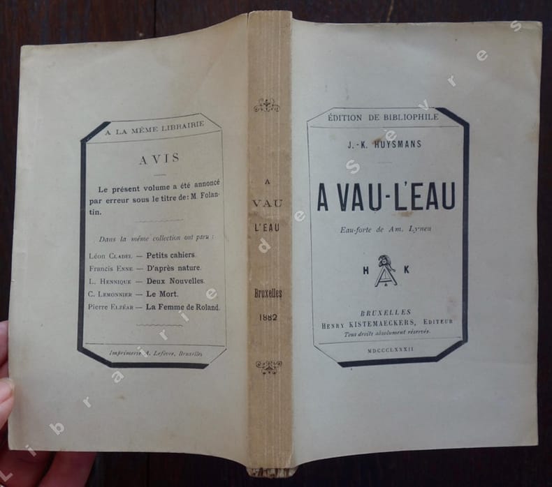 Édition originale. Un des 1000 exemplaires sur Hollande, seul tirage avec 10 Japon. Portrait-frontispice à l'eau forte signé de Am. Lynen. Deux ans avant À rebours, Huysmans campe en Jean Folantin un personnage qui préfigure, par son dégoût de la vie et du monde, son vide spirituel impossible à combler, ses manies de solitaire qu'arrachent parfois à son indifférence de passagères obsessions, la figure de Des Esseintes… Mais c'est un Des Esseintes pauvre, un simple vendeur dont l'univers - peuplé de petites misères, de restaurants bon marché, de rencontres décevantes avec d'autres ratés - demeure proche du roman naturaliste auquel Huysmans s'apprête à tourner le dos. Devant cette contradiction apparente, on se posera la question: À vau-l'eau, œuvre déjà symboliste? Sans doute, en ce que la pauvreté relative du personnage n'est pas tant celle, sociale, économique, qu'entend décrire Zola, que cette pauvreté d'essence presque métaphysique, ce joug inflexible imposé par la laideur aux natures sensibles dont le prophète malheureux fut Baudelaire. Bel exemplaire en reliure mosaïquée de Vermorel. Petite décoloration du dos. Les couvertures conservées nous apprennent - via l'avis sur la seconde - que l'ouvrage avait d'abord été annoncé par l'éditeur sous le titre fautif M. Folantin.