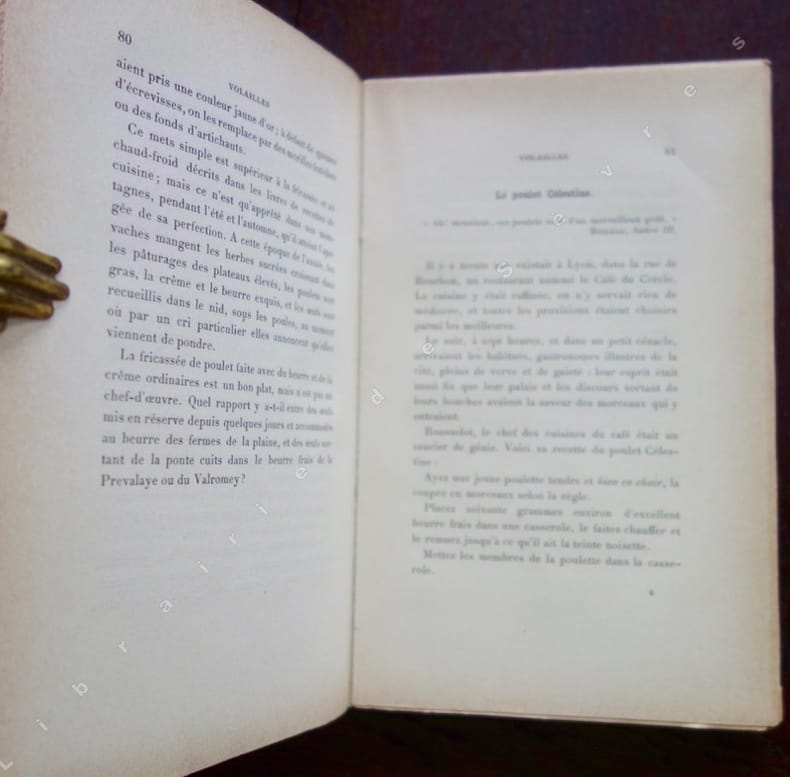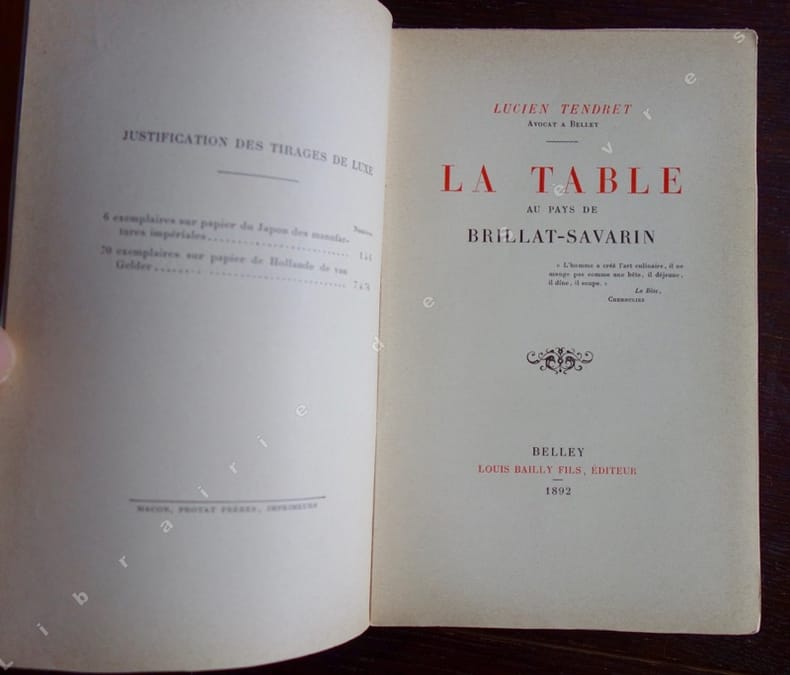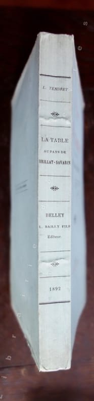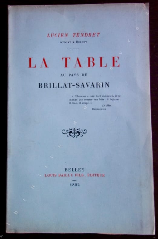 Lucien Tendret avocat à Belley et neveu de Brillat-Savarin, fit paraître en 1892 cet amusant ouvrage, véritable livre de "cuisine-fiction" qui aurait inspiré Marcel Rouff pour son Dodin-Bouffant. Regorgeant d'anecdotes, ce pittoresque recueil fait défiler sous les yeux du lecteur aux papilles enthousiasmées toutes les richesses gastronomiques du Bugey natal de Tendret : chapons, dindons, écrevisses, lavarets, morilles, légumes à la saveur incomparable... Il consigne également des recettes fameuses : Le Poulet Célestine, L'Oreiller de la Belle-Aurore, ou encore cet étonnant Chapeau de M. Gabriel Cortois de Quincey, toutes préparations faisant appel à force truffes, volailles et autres gibiers. Voir le sommaire sur photos jointes.