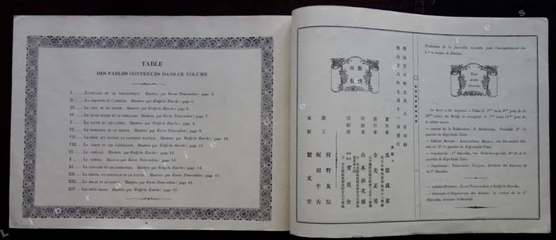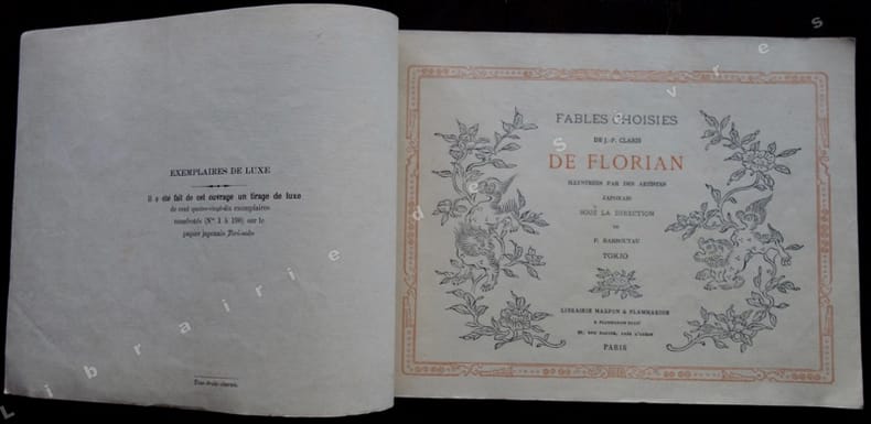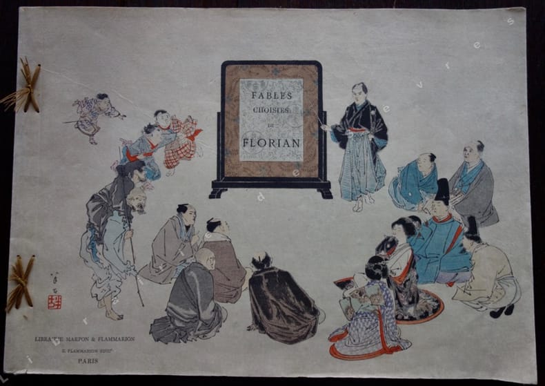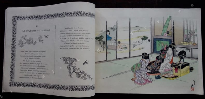 1895 Paris, Librairie Marpon & Flammarion, (1895), publié par P. Barboutau pour Flammarion, à (Tokio le 7e mois 8e jour de la 28e année du Mei-dji (...), éditeur : Kané-Mitsou Masa-o, 1 vol. in-4 broché, oblong à l'italienne (23,5 cmx 33 cm), de (2)-18-(2) pp. + 14 estampes en couleurs à pleine page, + la couverture en couleurs, les pages sont imprimées sur un seul côté, pliées et reliées en accordéon ne laissant ainsi pas apercevoir le côté non imprimé, ce qui confère une continuité parfaite aux pages imprimées (technique japonaise), couverture illustrée en couleurs sur le 1er plat, très bel exemplaire.