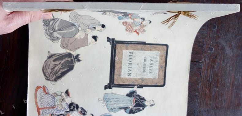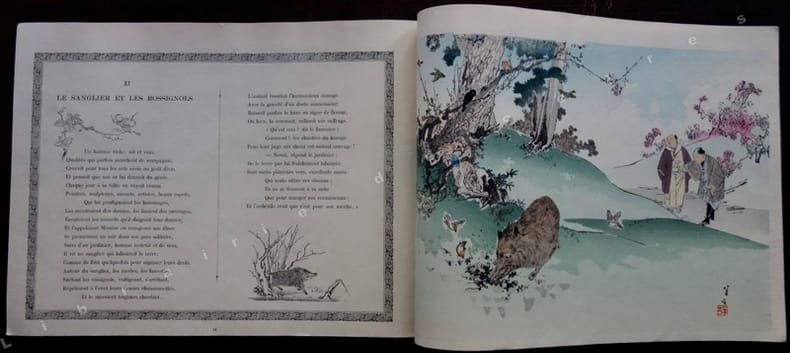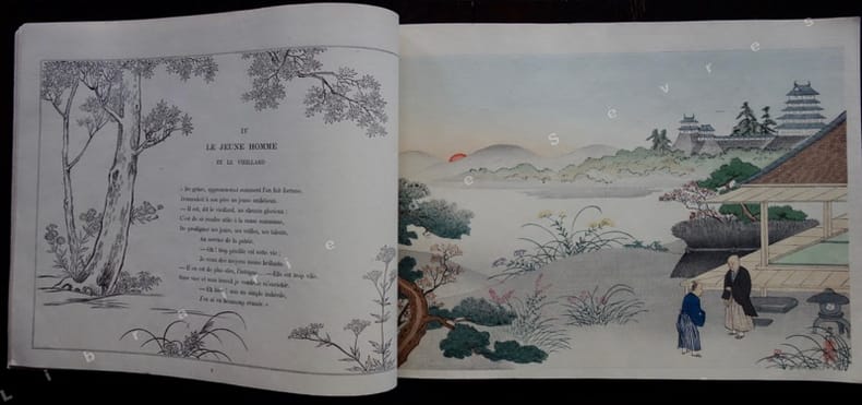 Exemplaire du tirage de grande dimension, avec les estampes tirées à pleine page. A ne pas confondre avec le tirage sur papier crépon comportant les hors-texte sur double-page et de format plus petit (15 cm x 20,1 cm). Splendide ouvrage illustré d'estampes japonaises en couleurs, dont 1 en couvertures et 14 hors texte, par KAJITA Hanko, KANÔ Tomonobu et KUBOTA Tôsui, et de nombreux dessins en noir dans le texte.