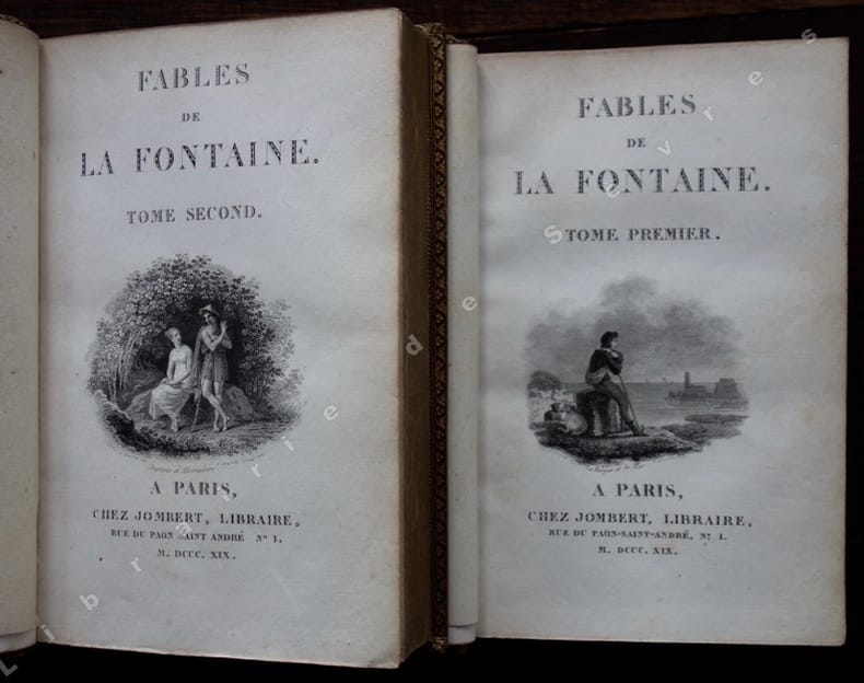 Ensemble complet des 7 volumes le constituant ; ainsi que de ses 19 jolies planches gravées montées sous serpente. Exemplaires revêtus de reliures décoratives du temps signées Gaillardet dans la doublure du chacun des volumes. ''Cette édition fait partie des Chefs d'oeuvre de la littérature française. Elle est ornée de 16 gravures et 3 portraits hors-texte. Les gravures des Fables portent leur titre ainsi que deux ou trois vers ; elles sont imitées d'Oudry. Les autres gravures sont signées de Staal ou Delannoy et portent seulement leur titre. Contes et Fables sont ici rangés suivant l'ordre des éditions originales''. (in Rochambeau). Rochambeau, Bibliographie des Oeuvres de La Fontaine, colonne 1840 / 47 - Vicaire IV, Manuel de l'amateur de livres du XIXème, 932 (pour une édition millésimée 1872 - 1876). Dos passés. Petit manque de papier marbré affectant deux plats. Rousseurs en gouttières ; rares dans les corps d'ouvrages. Cerne claire en marge supérieure des feuillets liminaires du dernier volume. Un feuillet maladroitement découronnné. Nonobstant, ensemble - décoratif - en belle condition. Lequel a ici conservé de larges témoins.