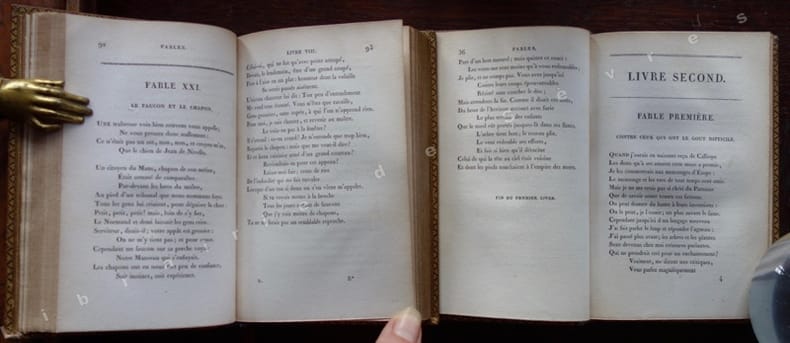 Elle comprend 120 Fables en édition originale. Paris, Denis Thierry et Claude Barbin, 1678-1679-1694. 5 volumes, nombreuses figures de F. Chauveau, gravées sur cuivre et tirées à mi-page. Ensemble 5 volumes in-12. Plein maroquin bleu nuit, triple filet doré autour des plats, dos à nerfs richement ornés, double filet or sur les coupes, roulette intérieure, tranches dorées sur marbrures. Reliure signée de Belz-Niédrée vers 1865. Tome I : 57 gravures dans le texte, relié sans le f. d’errata puisque les fautes mentionnées ont été corrigées dans notre exemplaire ; Tome II : 60 gravures dans le texte ; Tome III : 44 gravures dans le texte ; Tome IV : 43 gravures dans le texte ; Tome V : 31 gravures dans le texte. Pte. déchirure anciennement restaurée pp. 91 et 221 du tome IV. 159 x 88 mm.