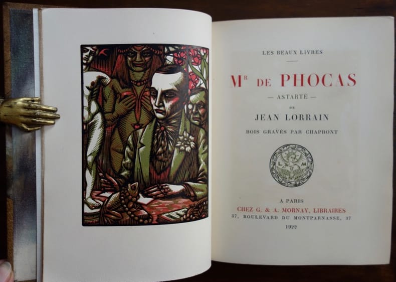 Paris G. & A. Mornay 1922 In-8 (h. 20 cm.) 308-(1) pp. broché, couverture verte et rouge à rabats. gravures sur bois en deux ou trois tons. Edition tirée à 1000 exemplaires, celui-ci est un des 940 sur Rives.