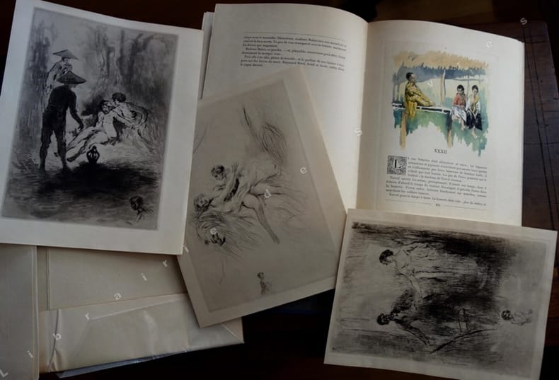 Très bel ouvrage illustré par Henri LE RICHE de 53 eaux-fortes originales en noir et en couleurs, dont 17 hors-texte en noir et 36 dans le texte coloriées "à la poupée" (Carteret IV 154, Monod 4477). Tirage à 300 exemplaires numérotés, dont cent sur papier Japon, dont notre exemplaire sur Japon portant le n° 51. Il est enrichi de 2 suites des hors-texte avec remarques (Un des 2 états manque pour l'un d'entre eux), de deux figures non utilisées en 3 états, et d'une suite des 36 eaux-fortes en couleurs avec remarques, le tout sur Japon. Henri Le Riche (1886-1944) avait séjourné au Japon et en Chine et rapporté de nombreux dessins inspirés de ses voyages.