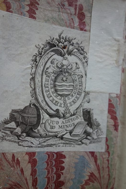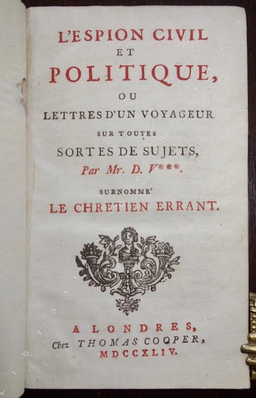 Edition originale et peu courante de ce recueil demeuré anonyme, de lettres fictives écrites par un voyageur qui se présente comme un espion civil et politique. Le titre voudrait nous faire croire que Voltaire en est l'auteur, mais il n'en est rien. Il fut attribué à Voltaire, mais également à Emer de Vattel, sans que l'on puisse l'affirmer avec certitude. Dans ces lettres, le voyageur décrit les différentes villes qu'il visite et les personnes qu'il rencontre, tout en fournissant des informations sur les affaires civiles et politiques de chaque lieu. Dans son ouvrage l'auteur critique les inégalités sociales et les abus de pouvoir des gouvernements. L'auteur utilise un style d'écriture élégant mêlé d'ironie pour souligner avec talent les absurdités de la société. Provenance : Ex libris armorié gravé de l'époque (XVIIIe siècle) surmonté de la devise "QUO ALTIOR EO MINOR", de la famille Juel (autrefois Juul), importante famille de la noblesse danoise, dont le nom a été relevé par des descendants en ligne féminine, les comtes Krag-Juel-Vind-Frijs et d'autres branches comme les barons Juel-Brockdorff. Elle est originaire du nord du Jutland et a donné nombre de serviteurs de la couronne et des chefs militaires. Les armes des Juel consistent en une étoile d'or à six pointes (par la suite sept) au-dessus de trois rivières d'argent sur fond azur.