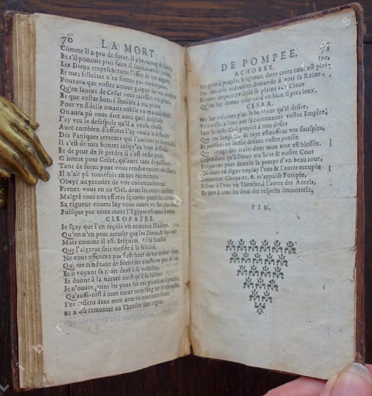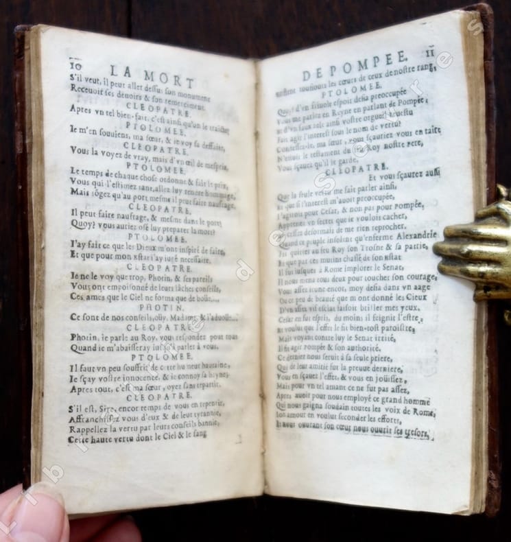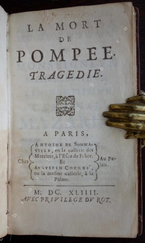 1644 Paris, Antoine de Somaville et Augustin Courbé, 1644, in-12 de (12) ff. (1f. blanc, 1 f. de titre, 3 pp. de dédicace, 6 pp. de remerciement à Mazarin (avec traduction latine)signée A. R. (Abrahamius Remius) ; 4 pp. d'avis au lecteur, 2 pp. d'extrait des auteurs latins, 5 pp. privilège, l'achevé d'imprimer (les mêmes que pour l'édition in-4) et la liste des acteurs ; 71 pp., reliure de l'époque de plein veau brun, dos lisse orné de fers dorés, encadrement de double-filets dorés sur les plats, bel exemplaire.