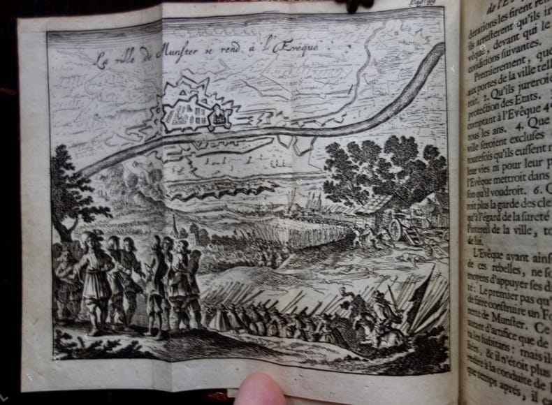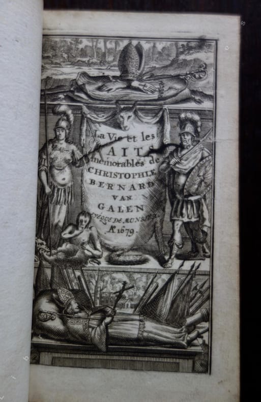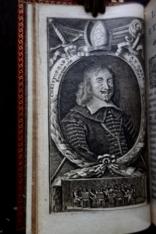Jolie édition, illustrée de plusieurs figures en taille-douce, que l'on joint à la collection des Elzevier. Cette biographie fourni l'exemple extraordinaire d'un évêque guerrier et sans scrupules, originaire de Westphalie. Au gré des alliances, tantôt avec l'un, tantôt avec l'autre, il guerroya contre tous. Il fut élu prince évêque, après la prise de Munster en 1650, mais les habitants se révoltèrent, et Van Galen dut assiéger sa propre ville en 1657. Allié de l'Angleterre, il combattit les Hollandais. En1672,accompagnant les Français, il enleva plusieurs villes à l'électeur de Brandebourg. Sismondi appelle Von Galen "une espèce de brigand mitré qui levait des troupes redoutables pour les mettre au service de quiconque voulait les payer, et les faisait vivre aux dépends des pays qu'elles ravageaient". (Rahir 2668; Willems 1938).