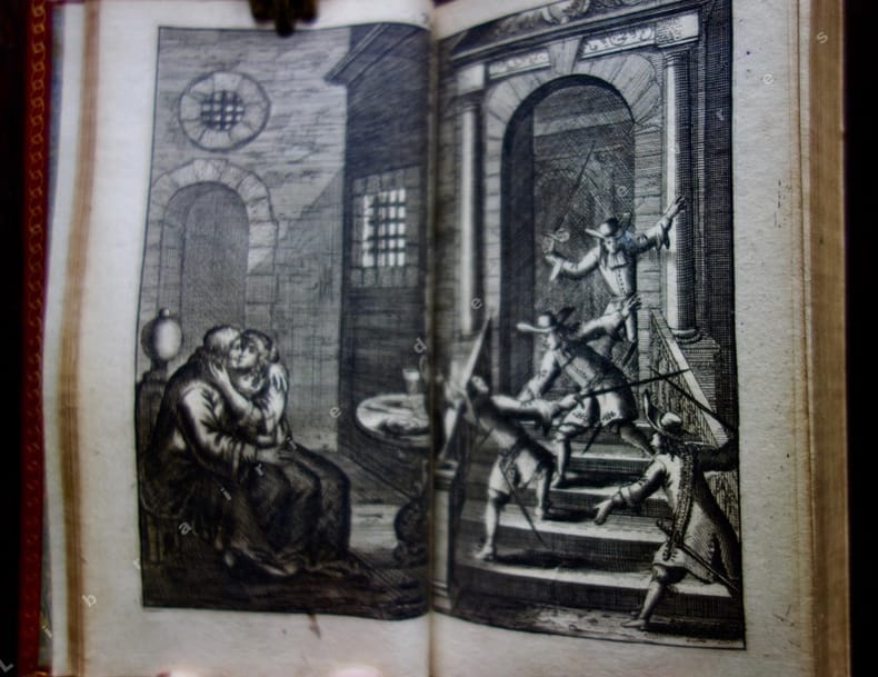 1679 Leide (Leyde), Jean Mortier, 1679, petit in-12 de 1 titre gravé en frontispice - (12)pp. dont page de titre - 1 portrait gravé, -248 pp., 9 figures gravées dont 3 sur double-page, très élégante reliure du XVIIe siècle de plein maroquin rouge dans le goût de Derôme, dos lisse orné de fers dorés, encadrement de liseré doré sur les plats, roulette dorée sur les coupes, chainette dorée à l'intérieur des plats, tranches dorées, très bel exemplaire.
