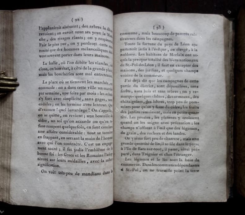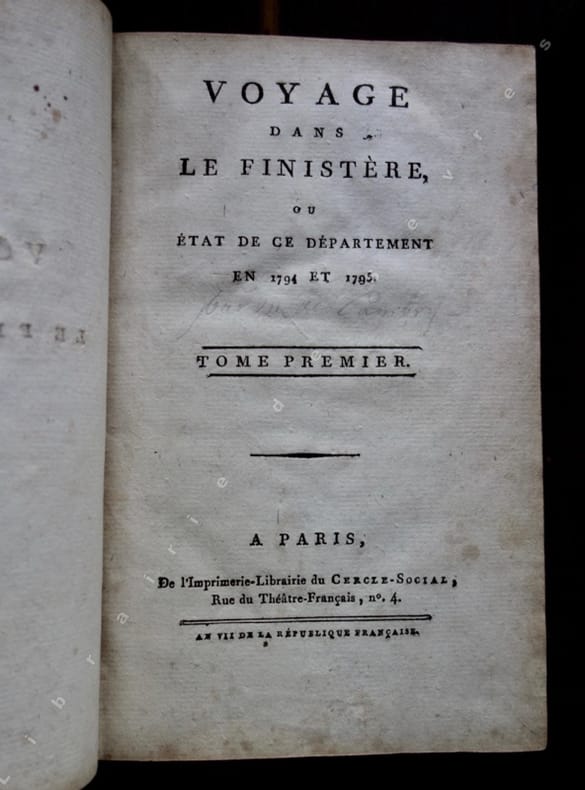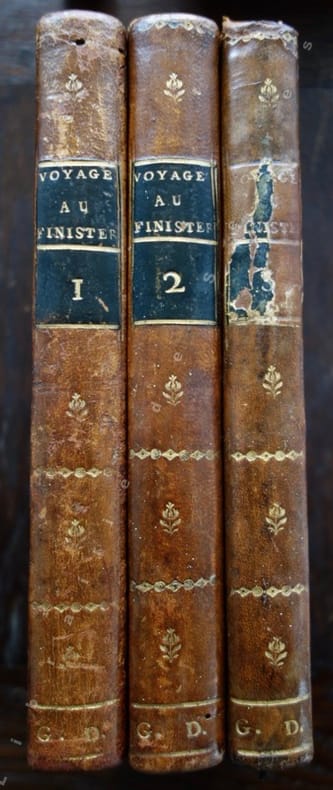 1799 Paris, Cercle-Social, an VII de la République (1799), 3 tomes en 3 volumes in-8 de (4)-IV-284 pp. ; (4)-394 pp. ; (4)-252-(1) pp., in fine une page d'état de population du département du Finistère, et 2 tableaux sur un feuillet dépliant, l'un "des mots constitutifs des langues", et l'autre "des phrases primitives formées des mots composés, tant naturels que renversés", reliure de l'époque de demi-veau brun, dos lisses ornés de roulettes dorées, pièces de titres vertes, la troisième manque en grande partie, initiales G. D. dorées en pieds des dos, dans cet exemplaire provenant d'un cabinet de lecture les 3 frontispices, les 4 figures hors-texte et la carte manquent, et semblent n'avoir pas été reliés ici, agréable exemplaire par ailleurs.