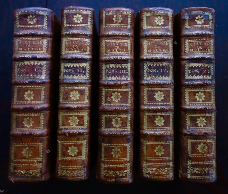 PARIS, chez Despilly, 1772 - In-12 - Reliure plein veau de l'époque (épidermures)- Dos à nerfs & à caissons fleuronnés - Pièces de titre & de tomaisons cerise, Titre & tomaison dorés - 2 Tomes sur V : T. III & V- 458 & 430 pages - Très frais intérieurementT. III : 1460 à 1530 - T. V : 1560 à 1720 + traité du Gouvernement ancien & moderne de l'Ordre & Militaire de S. Jean de Jérusalem