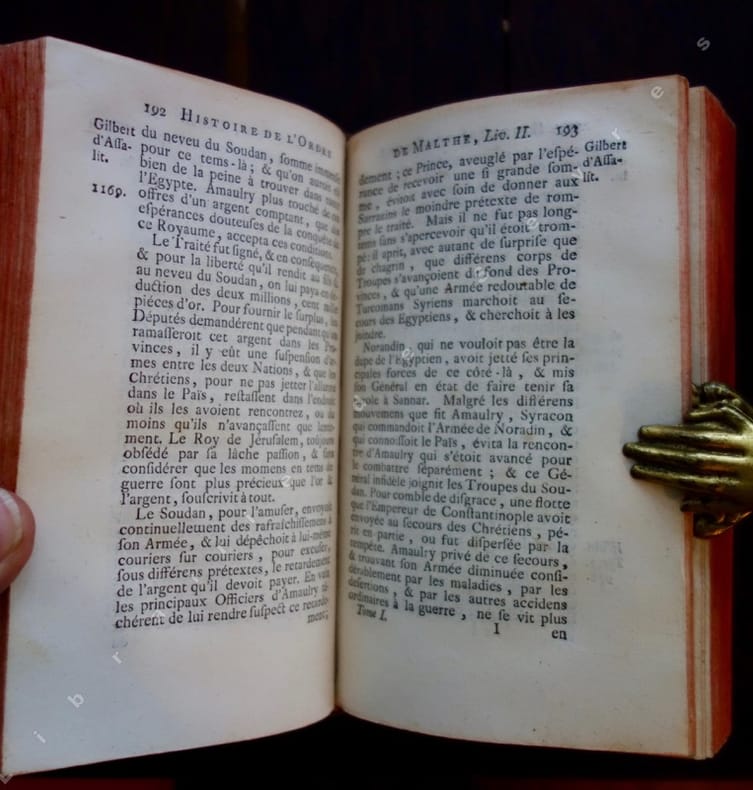 Cette histoire - publiée pour la première fois en 1726 - est considérée comme l'un des ouvrages de références sur les chevaliers de Malte. On y trouve les annales de l'ordre depuis sa fondation jusque dans les années 1720, ainsi que les anciens et les nouveaux statuts de l'ordre et la liste des chevaliers. Conformément à nos conditions générales de vente :Les frais de port sont affichés à titre indicatif. Il se peut que nous devions vous contacter pour vous informer du coût de laffranchissement supplémentaire en fonction du poids et du nombre de livres, surtout pour les envois internationaux Cependant vu l'augmentation des tarifs postaux à l'internationale, nous pouvons expédier les ouvrages en point relais MONDIAL RELAY pour les pays suivants : Allemagne, Autriche, Belgique, Espagne, Italie, Luxembourg, Pays-Bas, Pologne, et Portugal. Merci de nous indiquer en retour le point relais choisi ainsi que votre numéro de téléphone mobile & adresse Courriel pour assurer le suivi du colis.N'hésitez pas à nous interroger.In accordance with our general terms and conditions of sale:Shipping costs are displayed for informational purposes only. We may need to contact you to inform you of the additional postage costs depending on the weight and number of books, especially for international shipments.However, given the increase in international postal rates, we can ship books via Mondial Relay to the following countries: Germany, Austria, Belgium, Spain, Italy, Luxembourg, Netherlands, Poland, and Portugal. Please provide us with your chosen Mondial Relay point, as well as your mobile phone number and email address to ensure package tracking.Please feel free to contact us with any questions