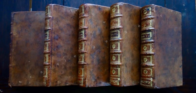 1742 Amsterdam, par La Compagnie, 1742, 5 tomes en 5 vol. de (10)-590 pp. ; (2)-479-(1) pp. ; (2)-542 pp. ; 514 pp. ; (2)-488 pp., reliure de l'époque de plein veau fauve granité, dos à nerfs ornés de caissons de fers dorés, pièces de titres de maroquin fauve et tomaisons dorées, très bel exemplaire, rare dans cette parfaite condition.
