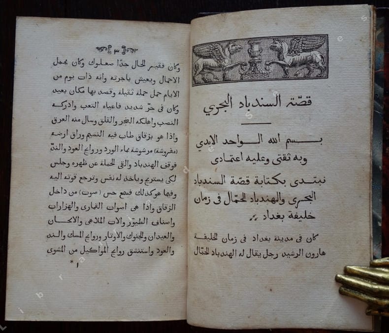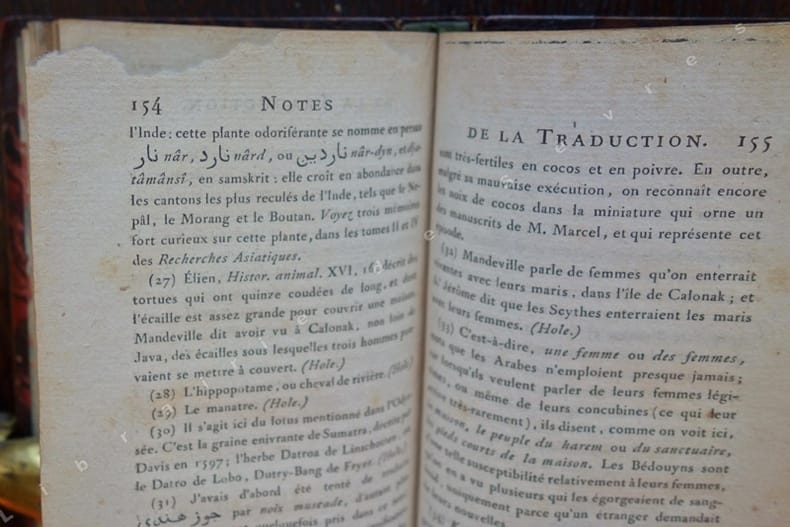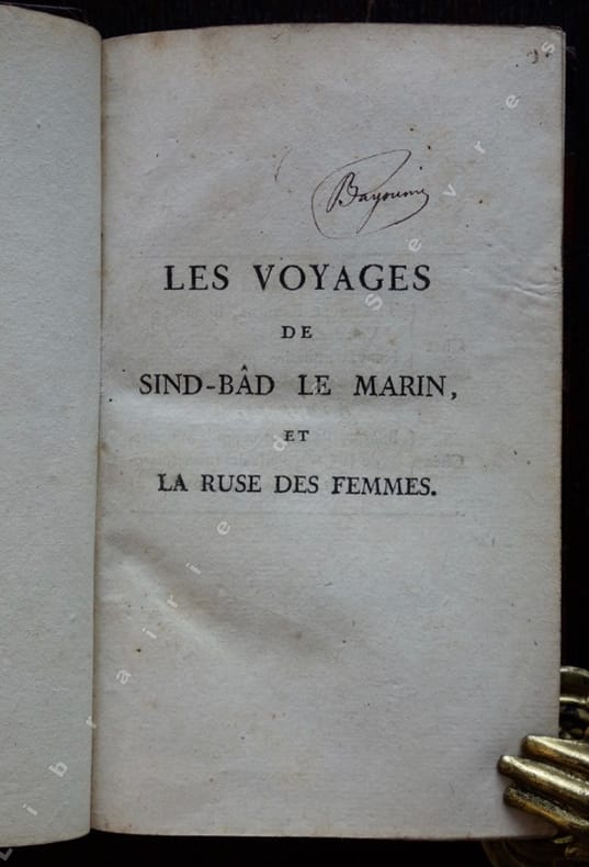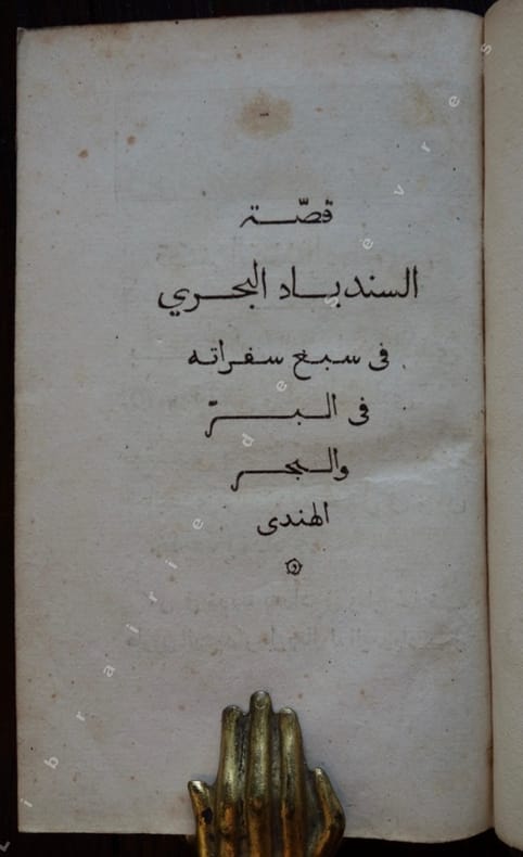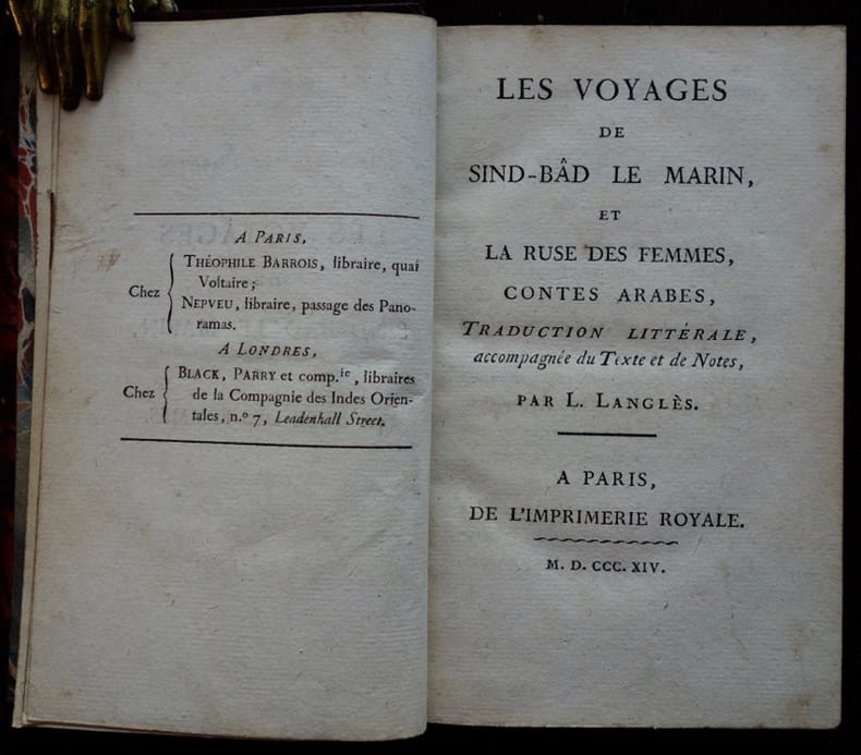 Edition originale de la traduction de L.-M. Langlès et publié par lui, de "Sind-Bâd" et première édition séparée d'une partie des contes imprimée en arabe. Faisant partie des contes des mille et une nuits (Alf Layla wa Layla) selon Schéhérazade. Il est supposé que cette série d'histoires qui relate le voyage de Sindbad, ont une origine plus ancienne et des sources diverses, qui y ont introduit des fragments d'Homère, Panchatantra et d'autres récits persans, arabes et indiens, aussi bien que des données anciennes sur la navigation et le commerce. Le voyage se déroule traditionnellement sous le règne d'Haroun al-Rashid, Sindbad entreprend sept voyages depuis Basra, chacun en entraînant un autre, rencontrant des créatures fantastiques, et contenant des aventures fantastiques dans un univers merveilleux. Louis-Mathieu Langlès (1763-1824), qui fut un important savant orientaliste, et correspondant de William Jones (1746-1794) à Calcutta. Langlès fut le premier directeur et le fondateur de l'École des Langues Orientales Vivantes à Paris, ou il enseignait le persan. "Un ouvrage classique, et d'une certaine importance sous le point de vue scientifique, historique ou littéraire" (préface). (Brunet, III, 820).