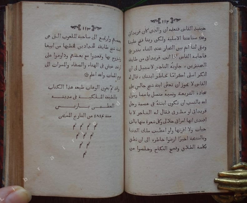 1814 Paris, Imprimerie Royale, 1814, petit in-12 de XXX-161-113 pp. (texte imprimé en arabe), reliure de l'époque de demi-maroquin brun à coins signée Hering en pied du dos, dos orné de lambrequins et filets dorés dans la hauteur, tranches dorées, bel exemplaire.