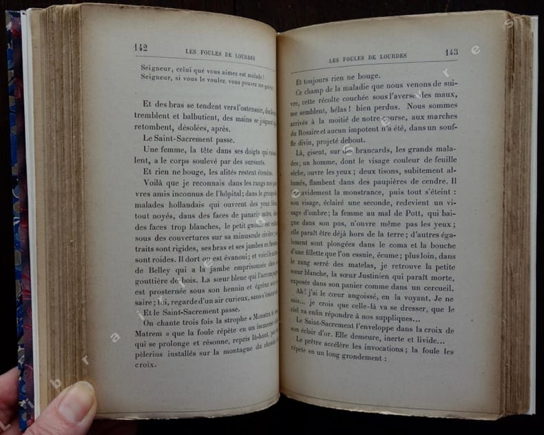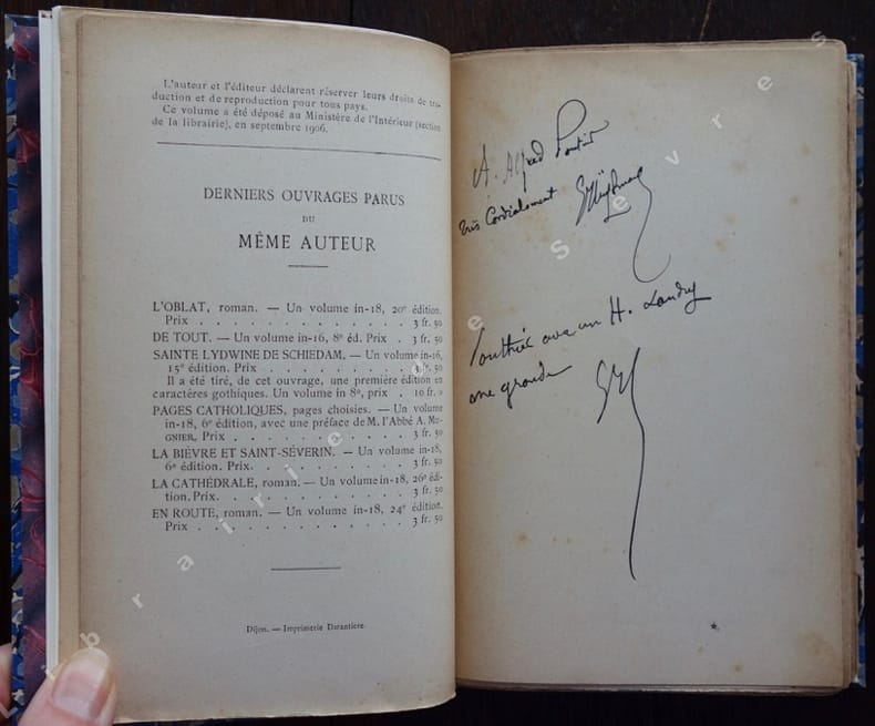 Éd. orig., ex. enrichi d'un double envoi autographe de l'auteur à Alfred POUTHIER (1866-1946), journaliste financier, poète et bibliophile, qui devint en 1910 un des plus chers compagnons de vieillesse de Léon BLOY. Dans son second envoi, Huysmans, sur l'instance de son ami Georges Landry, s'excuse de la faute d'orthographe qu'il a faite à son nom en oubliant le "H".