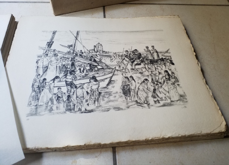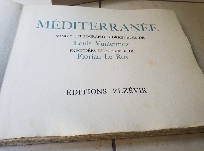 Chez Elzėvir en 1949 ( sans date), en feuillets sous couvertures grises rempliées, jaquette rigide et boîtier assorti, In8 à l'italienne de 34 pages, avec 20 lithographies originales sous serpente de Vuillermoz en noir.