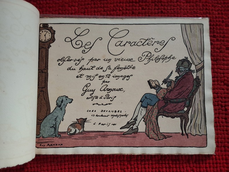 Paris, Devambez, s.d. (1920); in-4 à l'italienne, cart. bradel recouvert d'une toile fleurie, pièce imprimée sur le plat. (Reliure de l'éditeur). 28 pp. (texte). Titre illustré et 12 planches en couleurs. Guy Arnoux est le créateur d'un nouvel art populaire d'un caractère archaïque et moderne à la fois. Il reprend la technique de la gravure sur bois coloriée au pochoir. Les caractères représentés ici sont le gaillard, l'aventureux, le déterminé, le transi, l'impatient, l'empressé, l'avantageux, le jaloux, l'indifférent, le fâcheux, l'indiscret, l'officieux. Les scènes se déroulent sous le Règne de Louis XV. Tirage limité à 500 exemplaires numérotés. Celui-ci sur papier Ingres d'Arches porte in-fine la signature de l'éditeur.