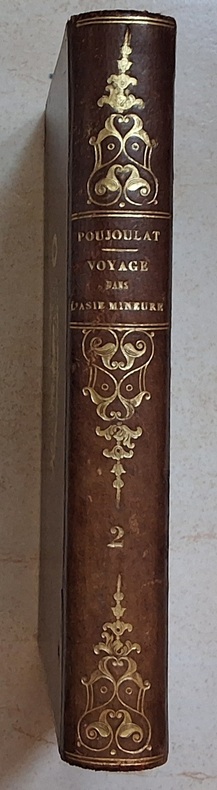 1) 2 ff.n.ch., pp. V-XII, 456 pp. - 2) 2 ff.n.ch., 612 pp.Gay, 110. Tobler, 151. Röhricht, 367. Atabey, 981. Blackmer, 1340. Édition originale."The work consists of 35 letters addressed mainly to his brother Jean Poujoulat and to Joseph Michaud who together had produced the Correspondance d'Orient […] Baptistin envisaged his work as a sort of continuation. The letters to Michaud begin from Athens in 1836; those to his brother are dated from Aleppo beginning in october, 1837. The last letter, dated from lower Egypt, is followed by a summary of events in Syria from 1838 to 1841. The letters describe mainly Asia Minor and Syria and include accounts of the Kurdish-Turkish wars and a long description of Palmyra. Poujoulat is a very interesting and penetrating observer, and his work is a worthy successor to the well-known Correspondance d'Orient" (Leonora Navari, catalogue Blackmer, n° 1340)