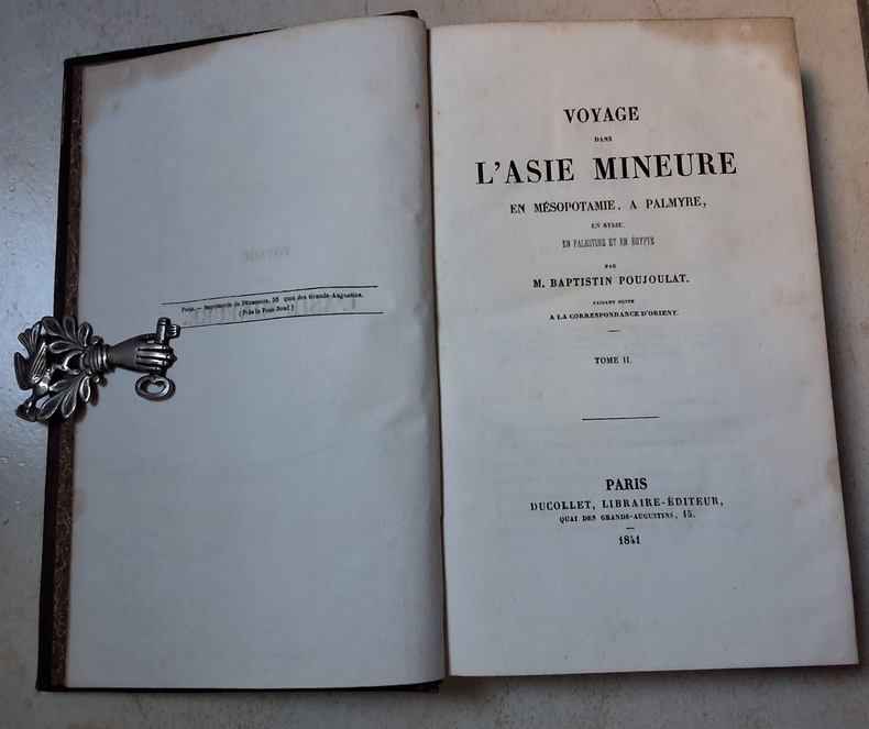 Édition originale. "L'ouvrage se compose de 35 lettres adressées principalement à son frère Jean Poujoulat et à Joseph Michaud qui avaient réalisé ensemble la Correspondance d'Orient. Baptistin envisage son œuvre comme une sorte de continuation. Les lettres à Michaud partent d'Athènes en 1836 ; celles à son frère sont datées d'Alep à partir d'octobre 1837. La dernière lettre, datée de la basse Égypte, est suivie d'un résumé des événements en Syrie de 1838 à 1841. Les lettres décrivent principalement l'Asie mineure et la Syrie et comprennent des comptes rendus des guerres kurdes-turques et une longue description de Palmyre. P1-28