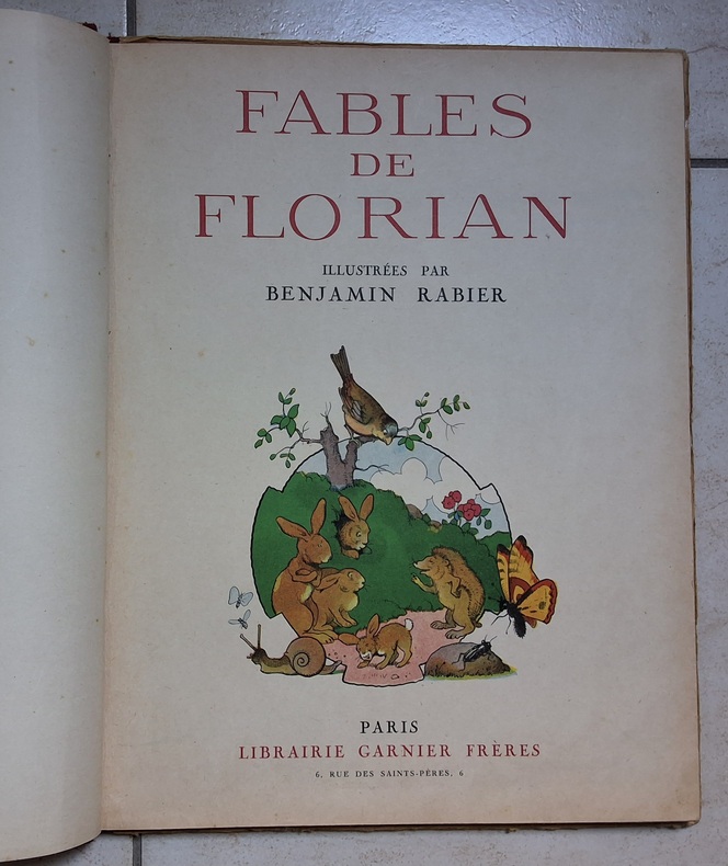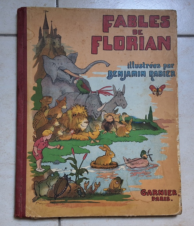 1 vol. grand in-8 reliure de l'époque demi-chagrin à coins bordeaux, dos à 4 nerfs dorés, triple filet doré en mors et coins, initiales L. G. au dos en queue, J.-J. Dubochet et Cie, Paris, 1842, XX-292 pp. avec 80 planches hors texte. Titre complet : Fables de Florian illustrées par J. J. Grandville, suivies de Tobie et de Ruth, Poèmes tirés de l'Ecriture Sainte, et précédées d'une notice sur la Vie et les Ouvrage de Florian par P.-J. Stahl [ Premier Tirage ]