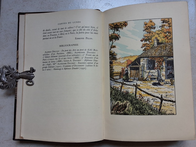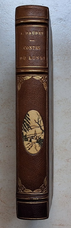 Chez Piazza en 1931, reliure demi chagrin Havane, dos mosaïquė à nerfs textes et décors or, paysage de campagne en couleur, tête dorée, tranches non rognées, liserés or sur plats et coins, 311 pages, couvertures conservées.