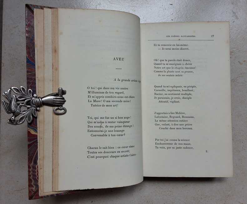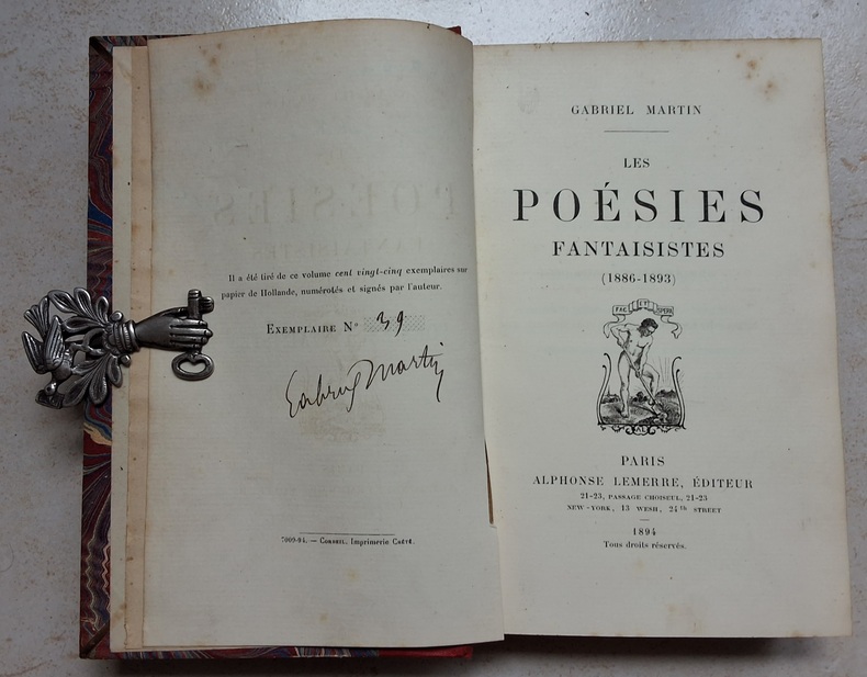 Chez Lemerre en 1894, reliure demi percaline rouge, dos à faux nerfs, textes et décors or, 324 pages, édition originale numéro 39/125 sur Hollande.