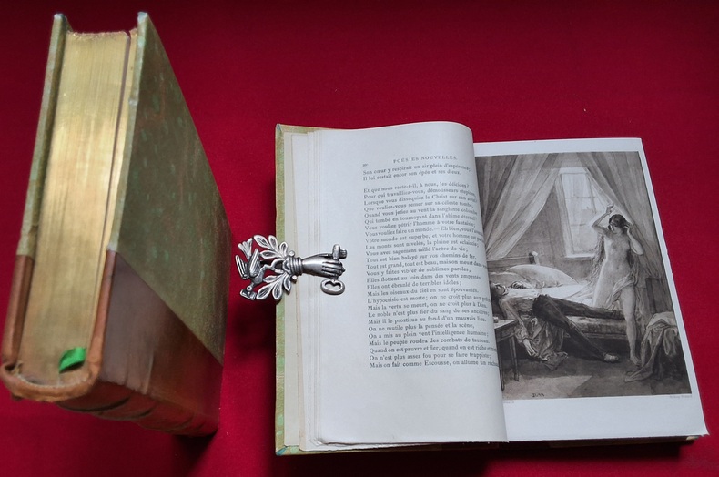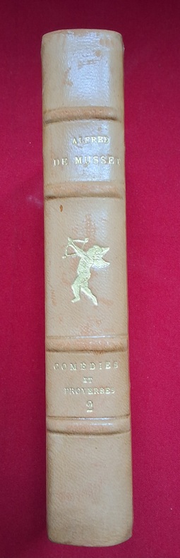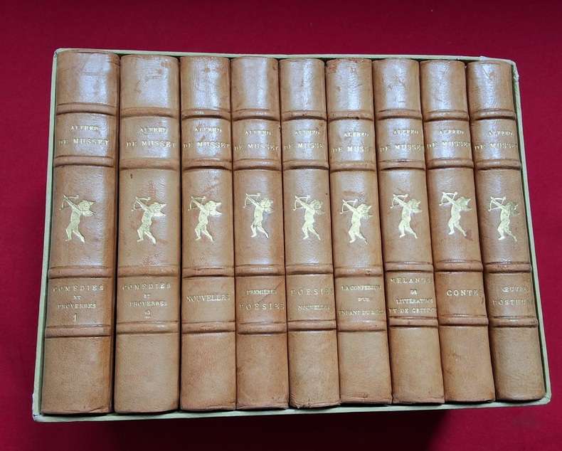 Chez Jouaust Librairie des Bibliophiles Flammarion vers 1900 sans date, 9 tomes dans leur boîtier reliés demi maroquin cognac, dos à nerfs textes or, silhouette de Eros or sur chaque volume, têtes dorées, signets.