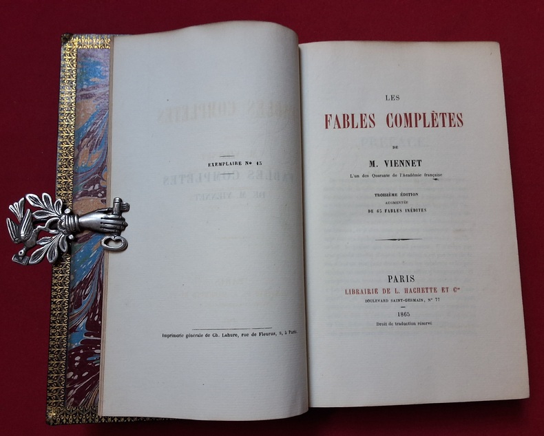 Chez Hachette en 1865, reliure plein maroquin noire, dos à nerfs textes décors et caissons or, 3 tranches dorées, triple liseré or sur plats, roulettes or sur contreplats, XXVII+395 pages, édition originale numéro 13.