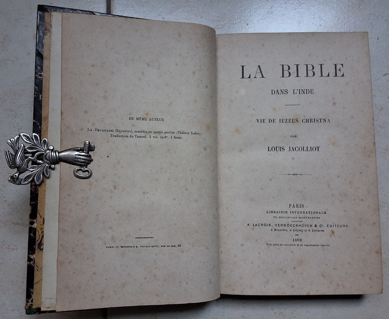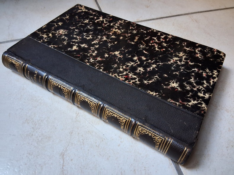 Chez Lacroix et Verboeckhoven en 1869, reliure demi maroquin noire, dos à nerfs textes et caissons or, signet, 391 pages plus catalogue, repiquage en frontispice en couleur d’un danseur de sabre japonais.
