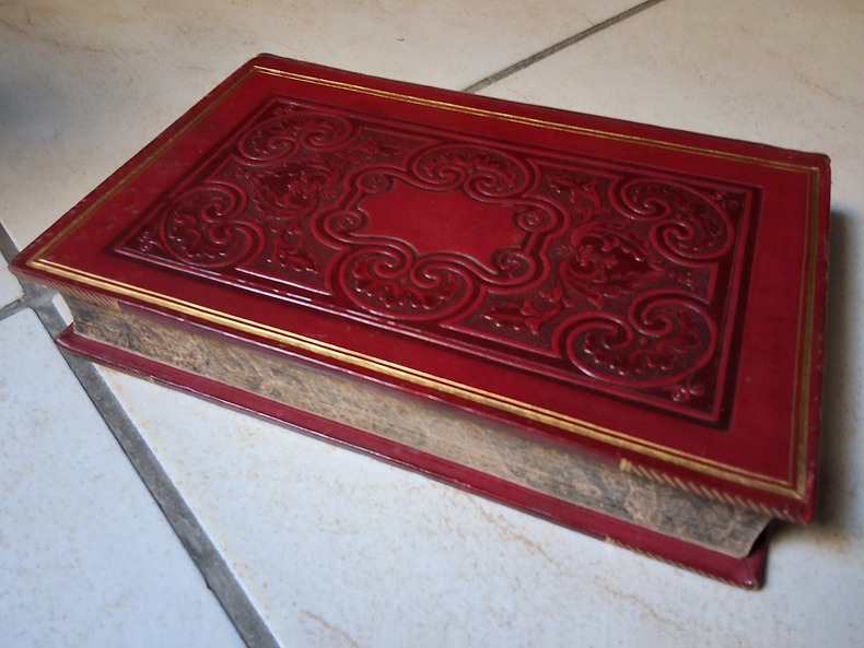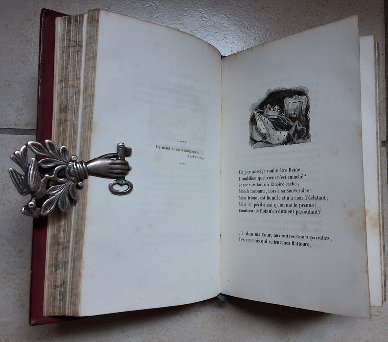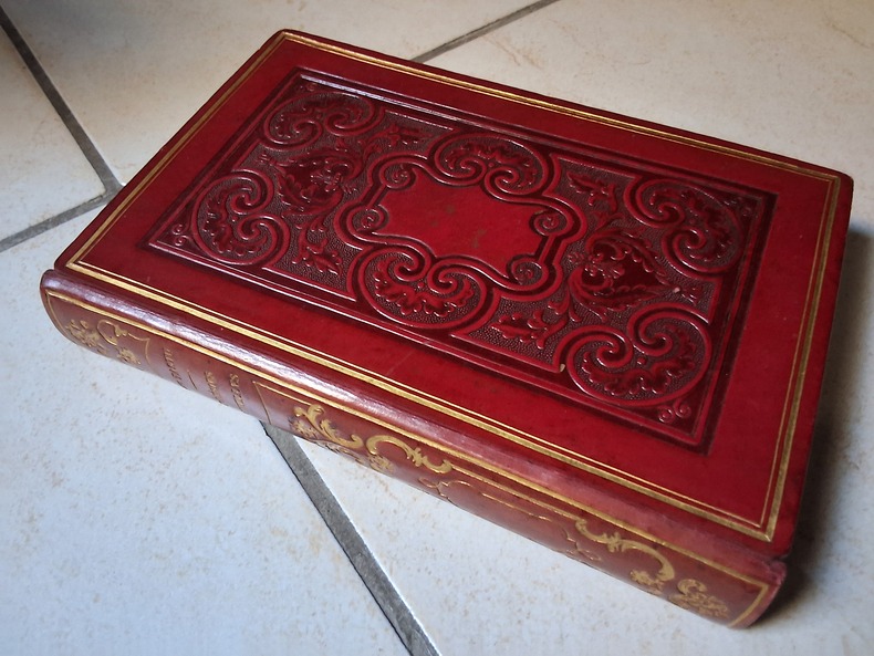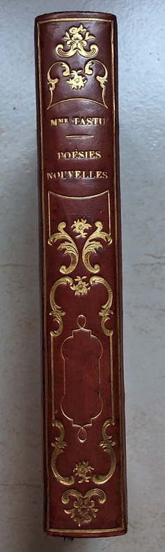 Chez Denain et Delamare en 1835, belle reliure romantique rouge, dos lisse à textes et décors or, plats estampés à froid, tranches jaspées, tête dorée, frontispice et illustrations en noir à chaque poème.