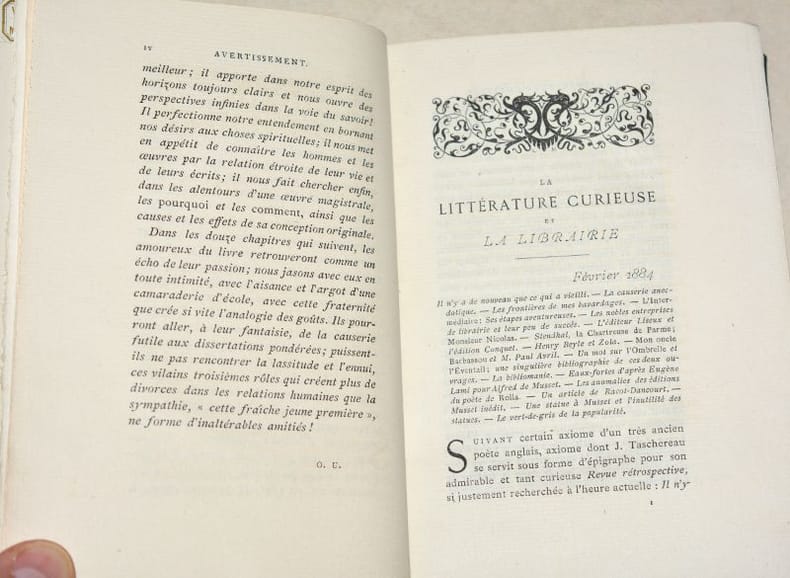 Paris, Quantin, 1886 In-12o, iv, 318, 1 pages. Frontispice gravé à l'eau-forte. Un des 30 ex. sur Whatman (no 1) avec le front. grave en sanguine et 2 fois en noir, rel. contemp. 1/2 basane a coins signée Champs, tete et dos a nerfs ornés, couverture conservée, Ex. libris grave de l'auteur Abel Moreau (1893-1977, Grand prix de l'Academie Fr.)