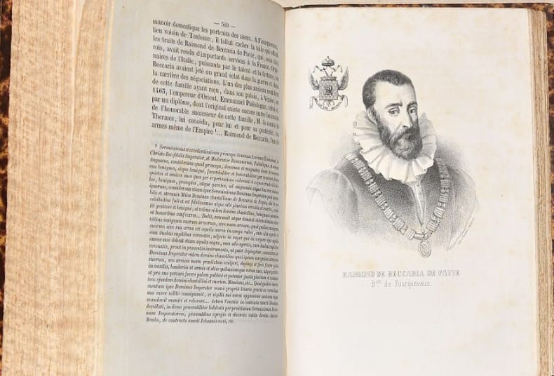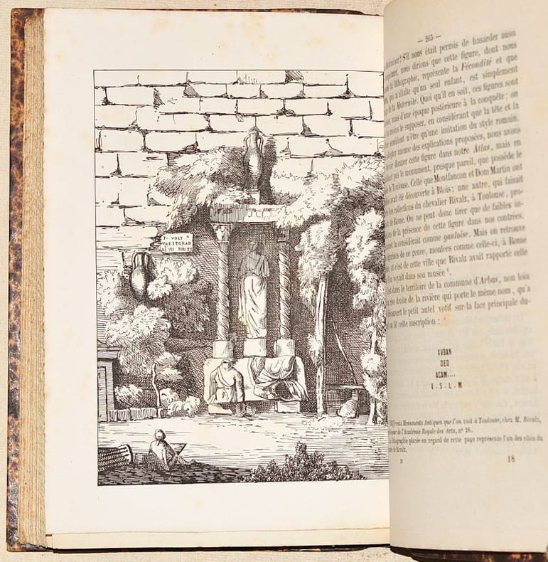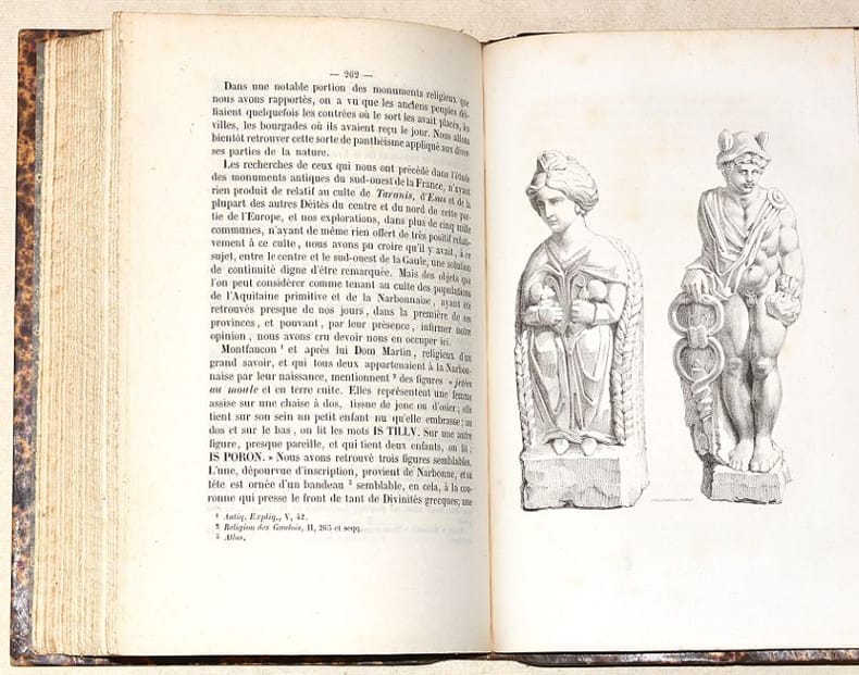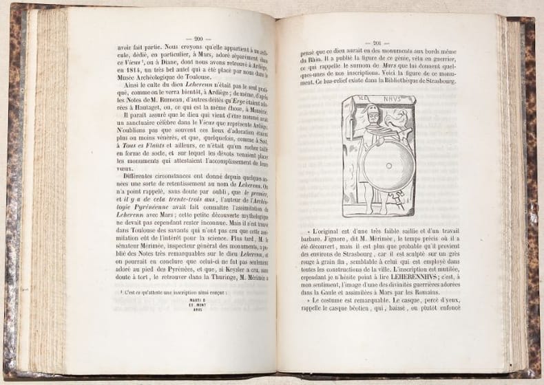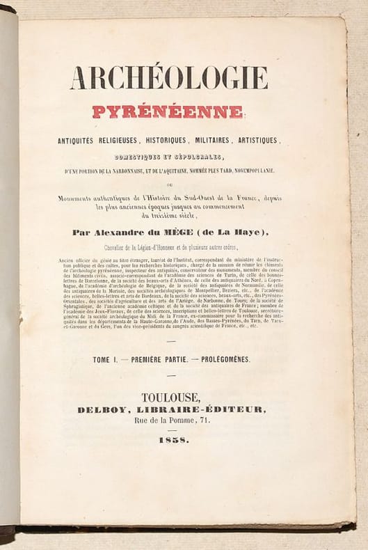 1858 Toulouse, Delboy, 1858-1862. Trois tomes in-8 (233 X 163 mm) demi-basane havane foncé, dos à nerfs filetés or, filets et fleurons dorés, titre doré (Reliure de l'époque). Tome I : (2) ff. de faux-titre et titre imprimé en rouge et noir, CLXXII-670 pages, 14 planches hors-texte (dont 1 à double page), (2) ff. de table et errata - Tome II : (2) ff. de faux-titre et titre imprimé en rouge et noir, XLII-395 pages, [8 ff. imprimés reliés entre les pp. 376 et 377], 5 planches hors-texte, (1) f. de table - Tome III : (2) ff. de faux-titre et titre imprimé en rouge et noir, 446 pages. Début de fente à deux mors, accroc et léger manque à la coiffe supérieure du tome 2, rousseurs claires à plusieurs planches.