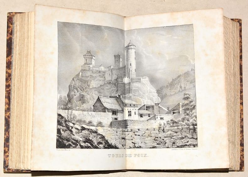 ÉDITION ORIGINALE de ce RARE OUVRAGE. Elle est illustrée de 19 PLANCHES hors-texte lithographiées dont trois repliées et une double représentant les "Tours de Foix". Exemplaire SANS l'atlas de planches, qui manque souvent et est rarement complet. BON EXEMPLAIRE, malgré les défauts à la reliure, au corps d'ouvrage frais, complet du texte et des planches. (Dendaletche, 2594). GOOD COPY. PICTURES AND MORE DETAILS ON REQUEST.