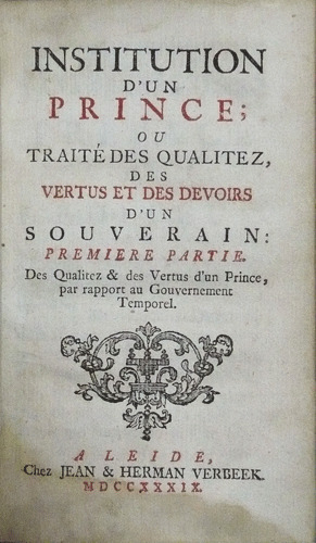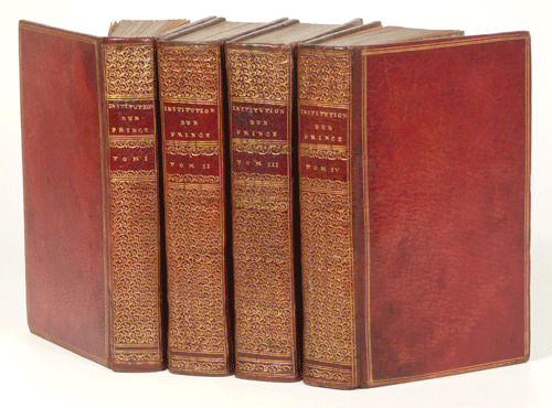 PREMIÈRE ÉDITION in-12 parue la même année que l'édition originale in-quarto éditée à Londres, chez Jean Nourse. Ce traité de l'éducation d'un prince est l'oeuvre d'un des personnages les plus attachants du parti janséniste ; Saint-Simon parle longuement des entretiens qu'il eut avec lui à l'abbaye de la Trappe : «on était également enlevé des grâces de sa conversation et en même temps épouvanté de l'étendue de ses connaissances. » Cette édition est enrichie d'une longue introduction biographique. Jacques-Joseph DUGUET est né en 1649 à Montbrison. Montrant d'intéressantes dispositions au cours de ses études, il entra à l'Oratoire et fut reçu en 1667 dans la maison de Paris. Après des séjours en Province, il fut ordonné prêtre en 1677. Professeur de théologie au séminaire de Saint-Magloire, il fut envoyé en 1682 à Strasbourg, ce qui semble avoir été une discrète façon de l'éloigner. En effet, la congrégation de l'Oratoire, secouée par la querelle janséniste, était alors en effervescence et Duguet, comme son contemporain Pasquier Quesnel, faisait montre d'un augustinisme rigoureux. Refusant de signer le formulaire, il quitta l'Oratoire en 1685 et fit auprès d'Arnauld et Quesnel un court séjour à Bruxelles. Sorti de la clandestinité en 1690, il s'éloigna peu à peu, par son refus des positions extrêmes, des plus acharnés des jansénistes. En 1712, il développa un "système sur la conversion des juifs", accomplissement prophétique et moyen de rédemption d'une Eglise corrompue. On retrouva ensuite de tels thèmes dans le courant figuriste parmi lesquels on retrouve l'abbé d'Etemare. Opposant à la bulle Unigenitus, il se retira en Savoie et y rédigea un TRAITE DE POLITIQUE d'inspiration chrétienne à l'intention du duc de Savoie, duc héritier devenu par la suite roi de Sardaigne. Cet ouvrage posthume fut publié en 1739, sous le titre "Institution d'un prince". De retour à Paris, il dut mener une vie de semi-clandestinité entrecoupée de périodes d'exil. Hostile aux Nouvelles Ecclésiastiques et aux convulsions, il s'éloigna de plus en plus des jansénistes extrémistes au nombre desquels on trouvait l'abbé d'Etemare et mourut en 1733. (BRUNET, VI, 423). EXEMPLAIRE de Germain PICHAULT de LA MARTINIERE (1697-1783), chirurgien, conseiller d'État et créateur des écoles de chirurgie en France. (Grand ex-libris gravé occupant tout le premier contreplat du Tome I). En 1747 il devient le chirurgien personnel du roi Louis XV qui l'honore de sa plus intime amitié jusqu'à sa mort, fonction qu'il conservera auprès de son successeur, Louis XVI. Second ex-libris gravé, datant de la fin du XIXe, de "Monica Soulas de Balcarce", collé sur la contregarde du premier tome. (Brunet, VI, 423. – Quérard, La France littéraire, 652-53). Cerne de mouillure claire en queue de l'ensemble des volumes, papier roussi, petites restaurations à quelques coiffes, mais BELLE RELIURE EN MAROQUIN DU TEMPS, d'intéressante provenance. GOOD COPY. PICTURES AND MORE DETAILS ON REQUEST.