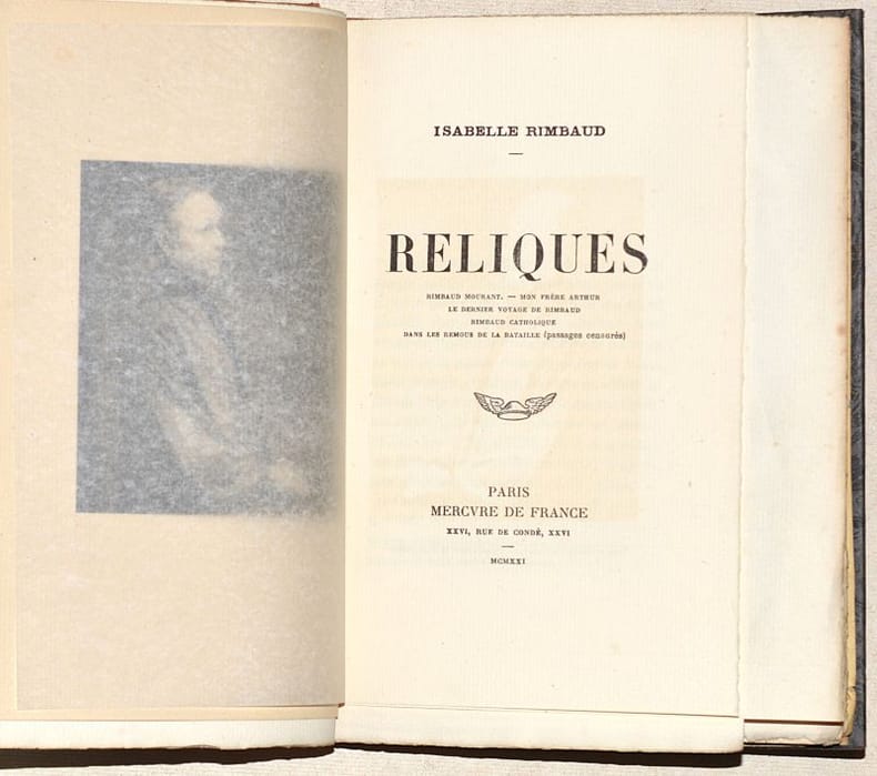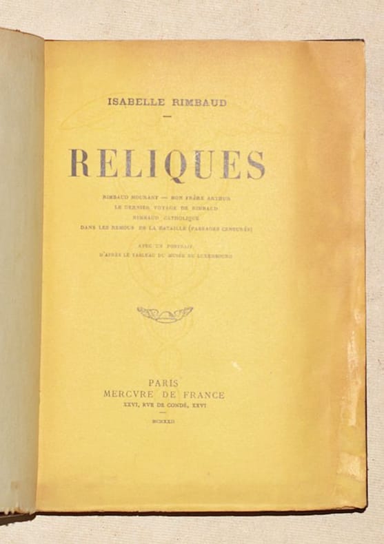 Troisième édition Paris, Mercure de France 1922. 12°. 1 f., 215 p., 4 f. Portrait d'Isabelle Rimbaud. Reliure cartonnage privée. Couvertures originales conservées.