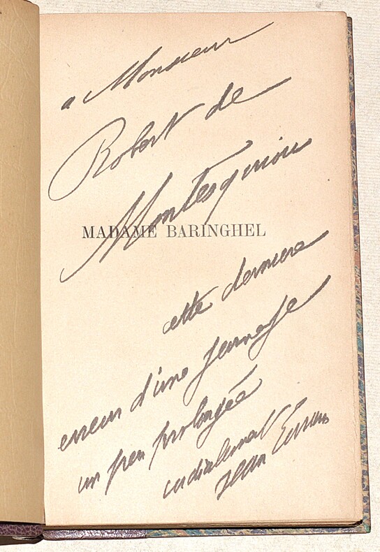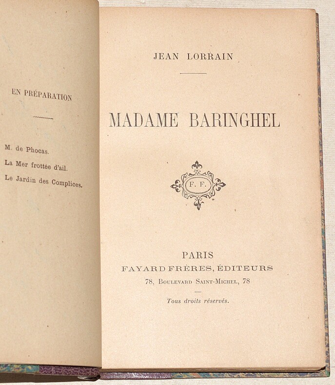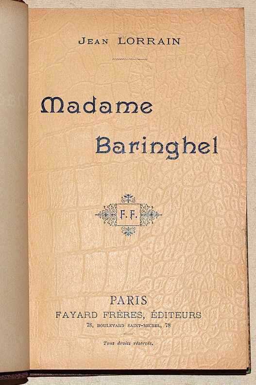 Fayard Frères, Editeurs "Paris, [sd] 1899, in-12 broché, couverture de papier gaufré façon crocodile. 1f.-XIV-306pp. Edition originale peu courante, sans mention sur papier d'édition, après quelques exemplaires sur papiers de couleurs rose et vert. Talvart & Place,T. XII, p. 237, n°28. Madame Baringhel recueille un ensemble de chroniques dialoguées, appelées ""Pall Mall"", publiées initialement dans l'Echos de Paris. Le personnage de Madame Baringhel, apparait d'abord dans La petite classe, publié en 1895. "