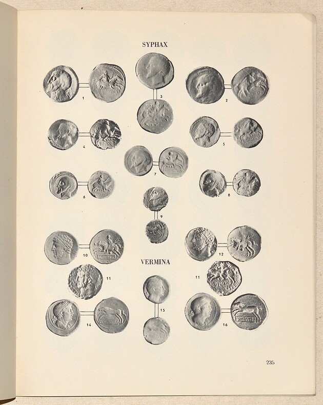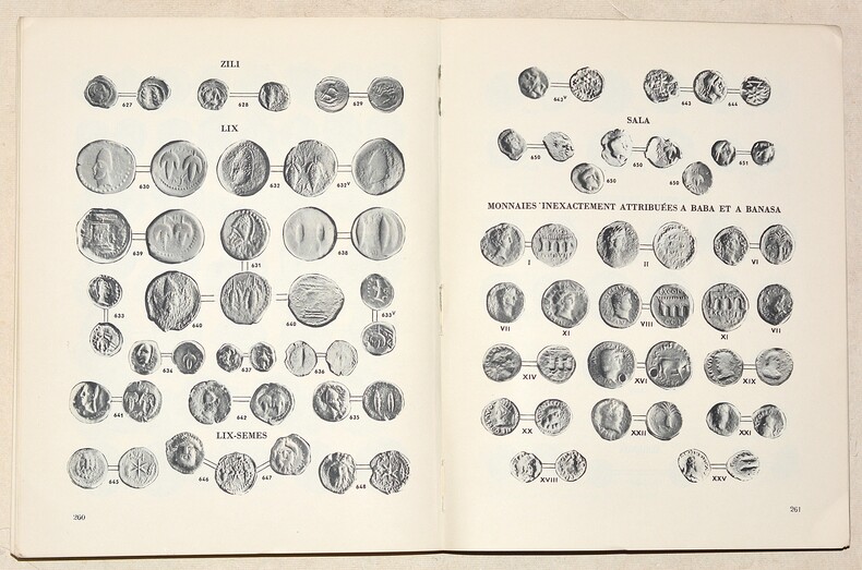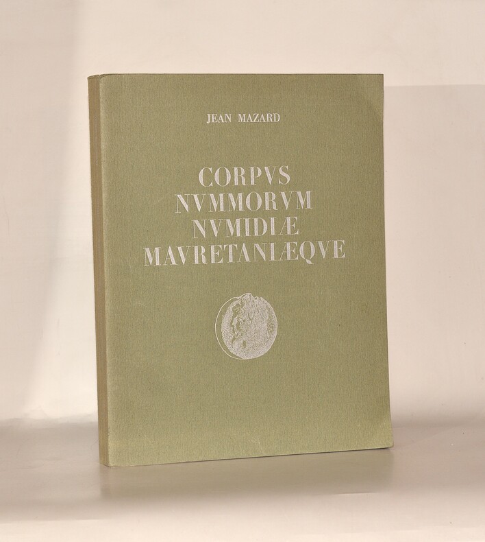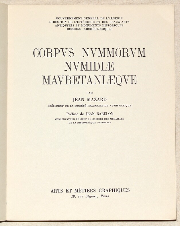 ÉDITION ORIGINALE de cet ouvrage de NUMISMATIQUE ANTIQUE qui concerne les MONNAIES DE NUMIDIE ET MAURÉTANIE ; il a été publié sur les instructions de Jacques Soustelle, gouverneur général de l'Algérie. Très nombreux dessins de monnaies dans le texte et, en fin d'ouvrage, cinq index et 28 PLANCHES de reproductions photographiques de près de 700 monnaies en héliogravure. Tirage limité à 3000 exemplaires numérotés. UN des 2000 réservés au gouvernement général de l'Algérie. Exemplaire en BEL ÉTAT, peu commun malgré le tirage annoncé. FINE COPY. PICTURES AND MORE DETAILS ON REQUEST.