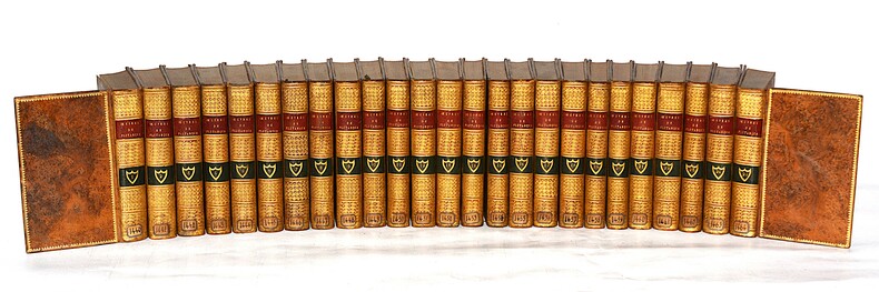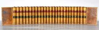 1801 Paris, Cussac, 1801-05. Vingt-cinq volumes in-8 (203 X 130 mm) basane fauve marbrée, encadrement de roulette dorée sur les plats, dos lisse cloisonné, compartiments entièrement ornés de croisillons et petits fleurons dorés, pièces de titre et de tomaison maroquin grenat et noir, coupes et coiffes ornées de roulettes dorées, tranches mouchetées en rouge (Reliure de l'époque). Manques à sept coiffes supérieures. Étiquette papier en pied de chaque volume.