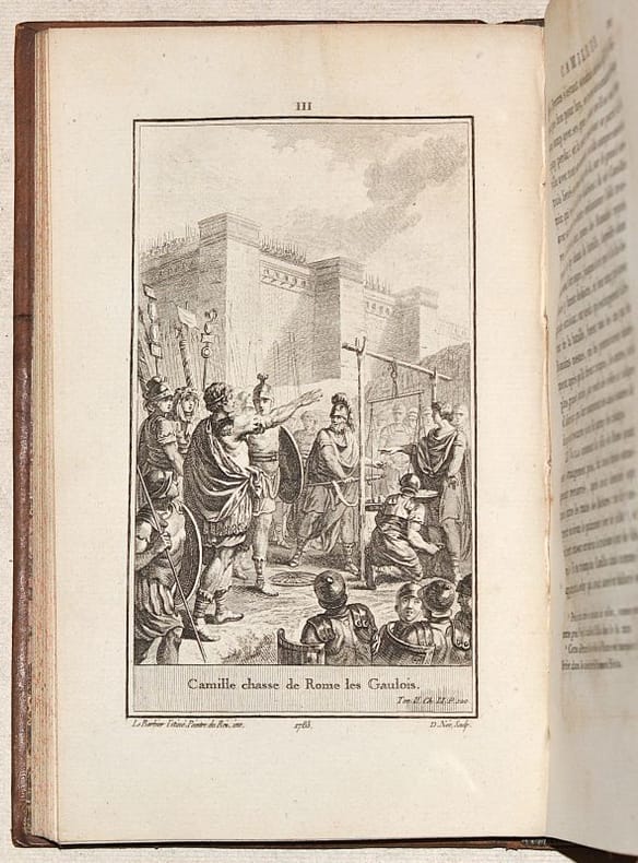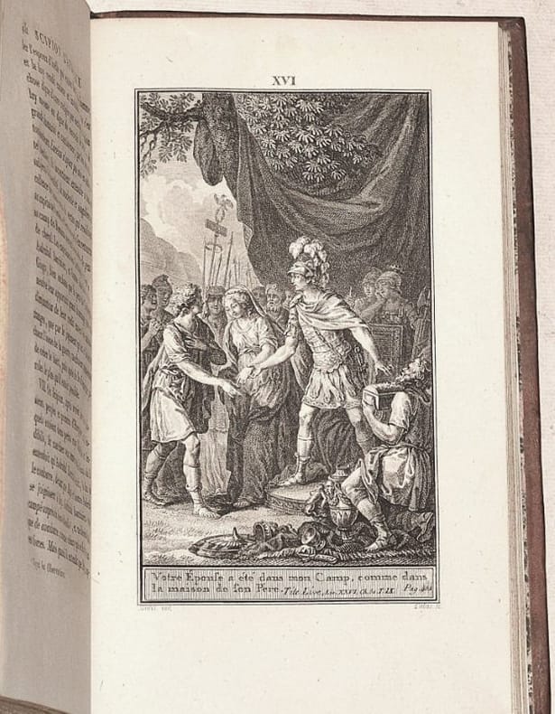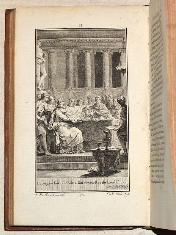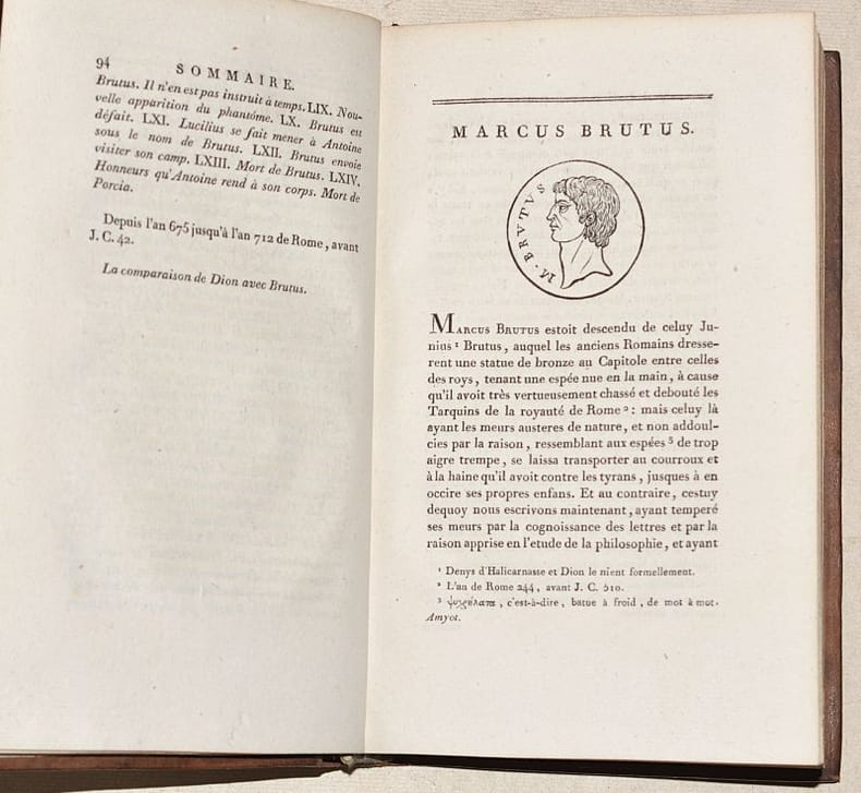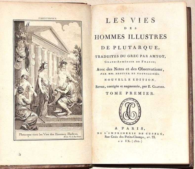 NOUVELLE ÉDITION de la traduction du grec par Jacques AMYOT (1513-1593) donnée par Cussac en 1783-87 (25 volumes), revue, corrigée et augmentée des notes d'E. Clavier, d’une table et de 131 MÉDAILLONS gravés sur bois. Les 12 premiers tomes sont constitués par le texte des "Vies des Hommes illustres", les tomes 13 à 17 par les "Oeuvres Morales", les tomes 18 à 24 par les "Oeuvres mêlées", le tome 25 et dernier constituant le volume de table des matières de ces deux dernières séries. Elle est ILLUSTRÉE de 21/22 PLANCHES hors-texte (la planche 18 MANQUE) de jolies figures par Borel, de Fraine, Moreau le jeune, Monnet, Marchand, Le Barbier, Myris, Marillier, gravées sur acier par Baquoy, Chateau, Halbou, Levillain, de Longueil, Née, Patas et Ponce. (Cohen, 810 pour la première édition de 1783-1805 - Brunet, IV, 739). BEL EXEMPLAIRE en basane glacée de l'époque, au dos décoratif. NICE COPY. PICTURES AND MORE DETAILS ON REQUEST.