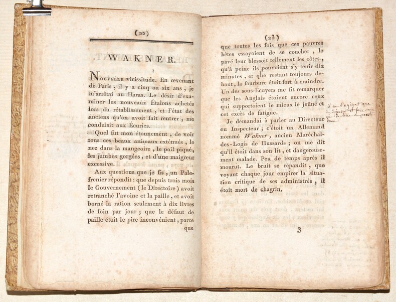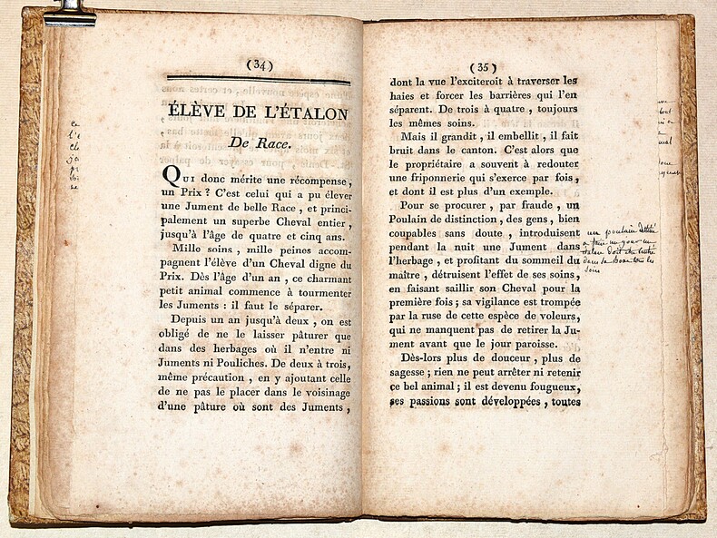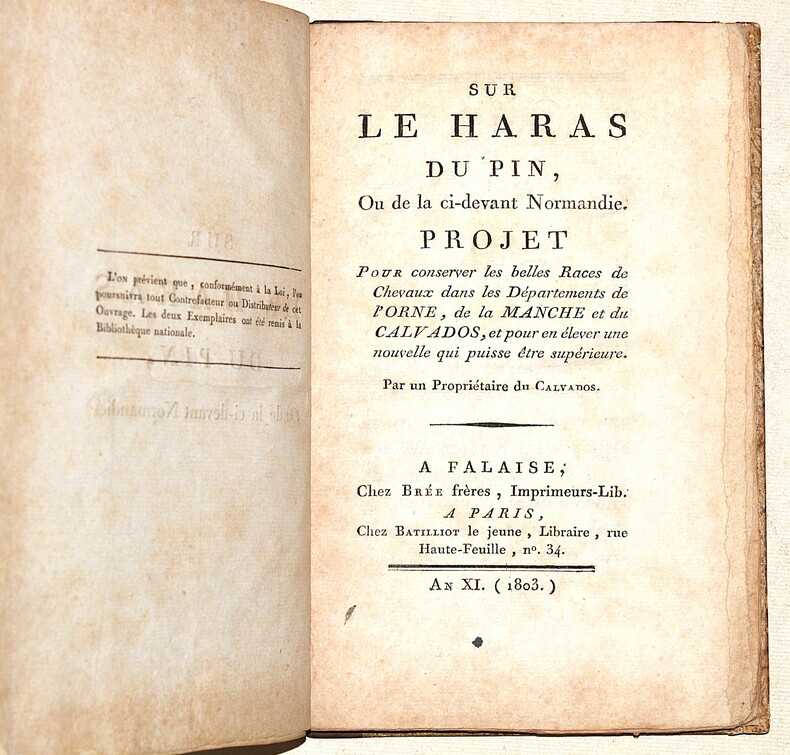 ÉDITION ORIGINALE de cette RARE PUBLICATION anonyme, dédiée par l'auteur à Napoléon Ier. « Petit ouvrage assez intéressant par sa description de l'élévage en Normandie après la destruction des Haras et la dévastation des réquisitions. À remarquer les passages où l'auteur affirme que les courses ne prendront jamais en Normandie et qu'il y faut décidément renoncer ! ». (Mennessier de La Lance, II-548). SÉDUISANT EXEMPLAIRE conservé dans une bonne reliure du XIXe siècle. PLEASANT COPY. PICTURES AND MORE DETAILS ON REQUEST.