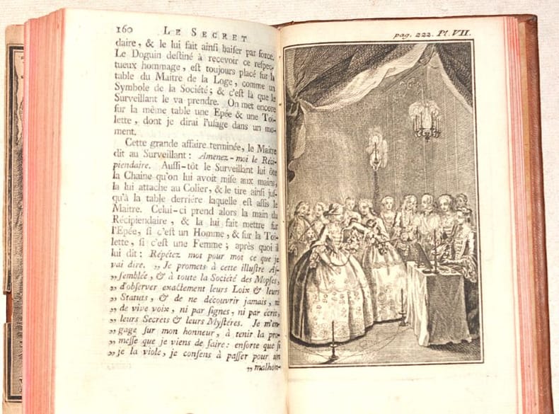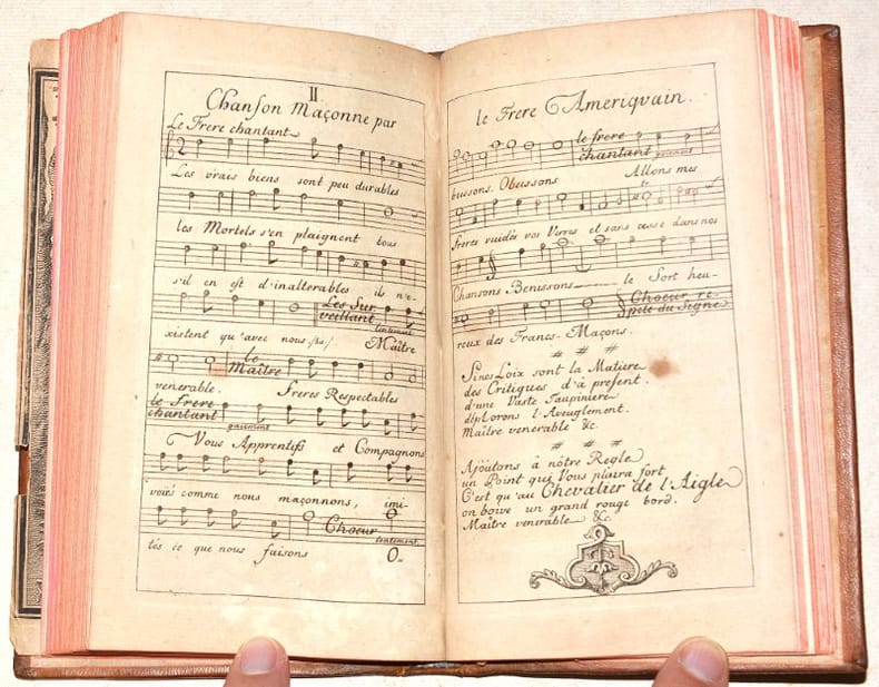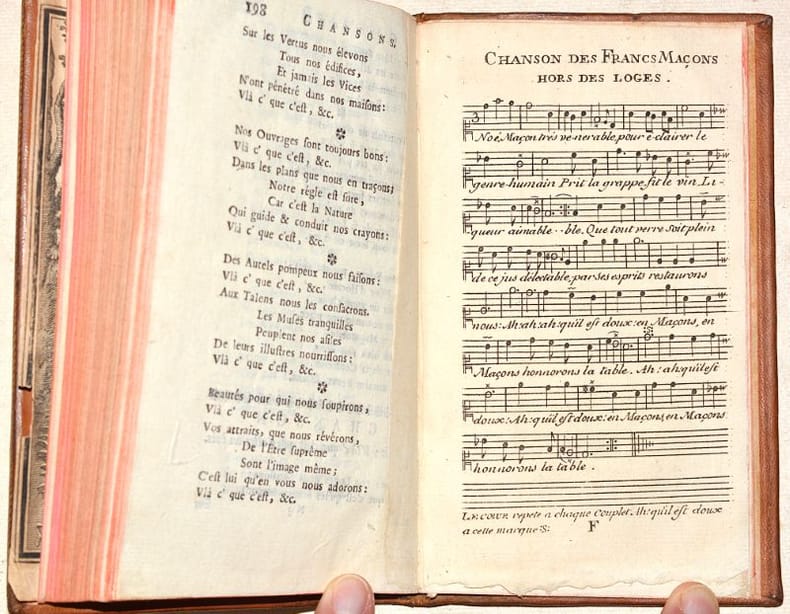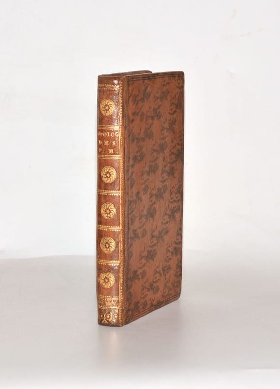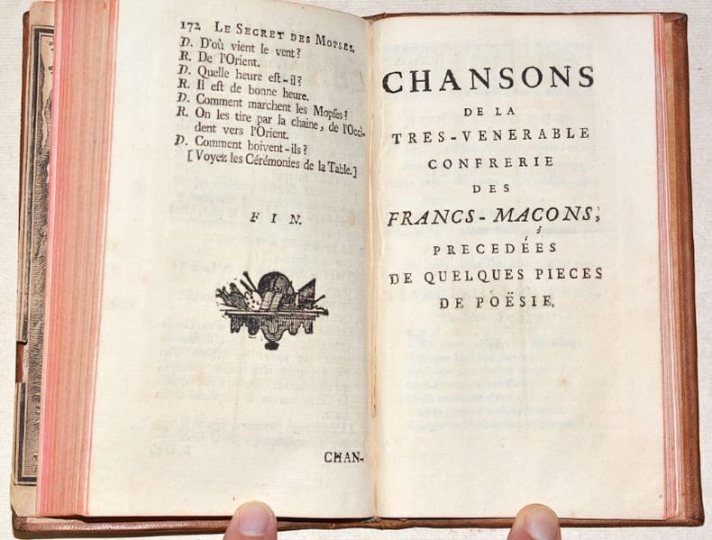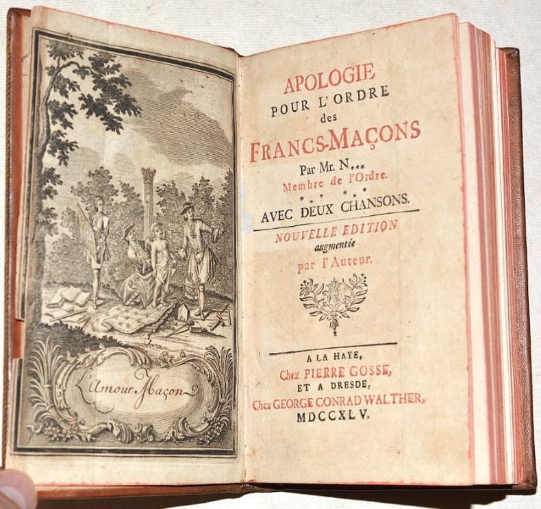 TROISIÈME ÉDITION, révisée et augmentée par l'auteur, la première ayant été publiée en 1742. Cet IMPORTANT TEXTE MAÇONNIQUE, publié anonymement, a été écrit par Johann Lorenz NATTER (1705-1763), graveur de pierres précieuses et médailleur allemand, membre de la loge maçonnique de Florence et fervent promoteur des idées maçonniques. Le FRONTISPICE représente Benjamin FRANKLIN (1706-1790), éminent franc-maçon, dans une scène titrée "L'Amour maçon" : c'est de lui dont il s'agit dans les deux chansons gravées à la fin de l'ouvrage, toutes deux titrées "Chanson Maçonne par le Frère Américain". (Fesch, 115 - Caillet, I-344 - Dorbon, 122 - Pas dans Sabin). Il a été relié à la suite 2 SUPPLÉMENTS avec page de titre propre et pagination continue ; ces deux textes prennent place à la fin de l'ouvrage "L'Ordre des francs-maçons trahi" de Gabriel-Louis Calabre PÉRAU (1700-1767), prieur à la Sorbonne qui se faisait appeler « abbé » mais ne fut jamais ordonné prêtre. Bien que le titre de l'ouvrage laisse entendre qu'il s'agisse d'un pamphlet anti-maçonnique, il n'en est rien et l'auteur s'en défend dans sa préface ; il dédie d'ailleurs l'ouvrage "au très vénérable Frère Procope". On trouve dans le premier supplément une belle GRAVURE de cérémonie maçonnique mettant en scène des femmes et une PLANCHE dépliante du "Plan de la loge des Mopses", légendée. Le second supplément comporte 5 PLANCHES gravées de musique. (Fesch, 1044, pour les suppléments). BEL EXEMPLAIRE de ce rare ensemble de textes maçonniques, très frais, conservé dans sa reliure d'époque en PARFAIT ÉTAT. NICE COPY. PICTURES AND MORE DETAILS ON REQUEST.