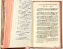 1745 La Haye, Pierre Gosse - Dresde, George Conrad Walther, 1745. In-12 (163 X 102 mm) basane fauve marbrée, double encadrement à froid sur les plats, dos lisse cloisonné et orné, pièce de titre maroquin havane, coupes et coiffes filetées or, tranches rouges (Reliure de l'époque) ; frontispice dépliant, (7) ff. de titre (imprimé en rouge et noir), dédicace, avertissement et table des matières, 126 pages, 2 planches gravées (dont 1 à double page) - [Relié à la suite :] Amsterdam et Genève, Henri-Albert Gosse, 1752. (1) f. de titre, 147-172 pages, 2 planches hors-texte (dont 1 dépliante) - (1) f. de titre, 175-205 pages, 5 planches hors-texte (dont 1 dépliante) de musique. Coiffe supérieure habilement restaurée, petit manque d'un centimètre en marge latérale du frontispice, sans atteinte au dessin de la gravure.