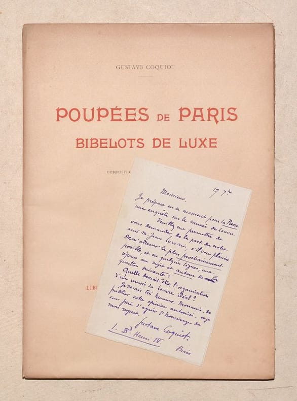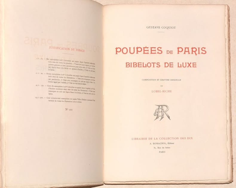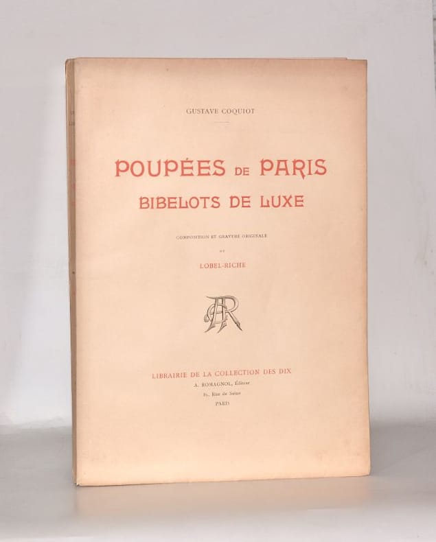 [Curiosa] [Alméry LOBEL-RICHE (1877-1950)] Gustave COQUIOT (1865-1926). POUPÉES DE PARIS. BIBELOTS DE LUXE. Composition et gravure originale de Lobel-Riche. Librairie de la collection des Dix. A. Romagnol, éditeur. 85, rue de Seine, Paris. 1912. Broché sous couverture rempliée, chemise et étui. Dimensions des feuillets : 31 × 23 cm. Une des meilleures illustrations de Lobel-Riche. Elle comprend quarante eaux-fortes, dont trente-huit à pleine page, représentant la vie de Parisiennes de mœurs légères. Exemplaire nominatif sur Japon, comportant une suite en noir (sur vélin) avec remarques. Sur un feuillet liminaire, après « Exemplaire imprimé pour », l’éditeur a écrit : « Monsieur et Madame / G. C[…] / souvenir amical / de l’éditeur / Romagnol ». Couverture manipulée et inégalement fatiguée, avec petites taches sur le premier plat, marque de pliure sur le même plat, dos avec petits manques en tête et queue à la jonction avec les plats, second plat inégalement insolé, toile de la chemise légèrement effilochée, fente à l’étui. Très bel état intérieur.