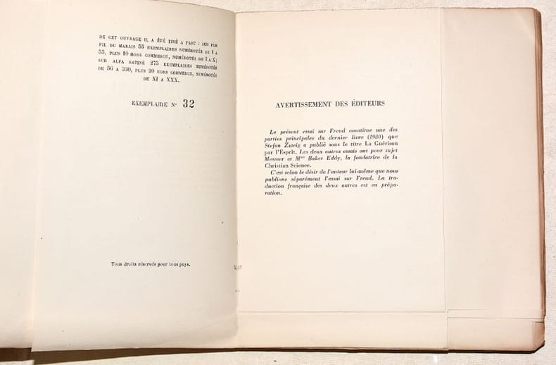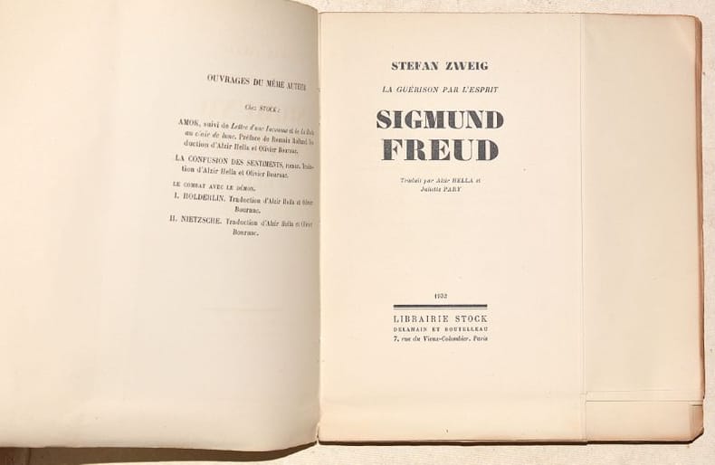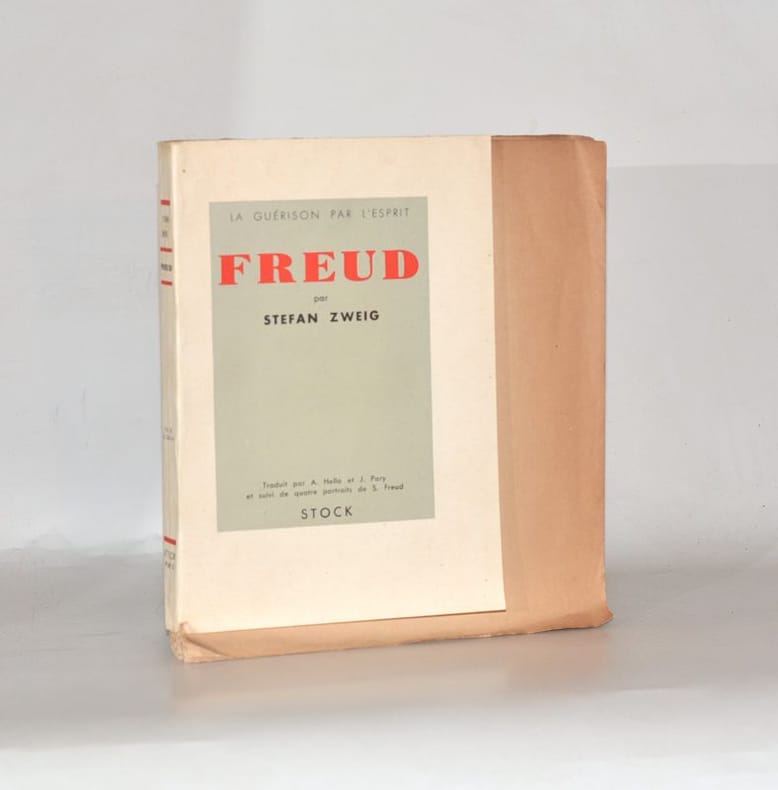 ÉDITION ORIGINALE de la traduction et PREMIÈRE ÉDITION FRANÇAISE de ce texte publié en 1931 sous le titre "Die Heilung durch den Geist" et qui contenait initialement les biographies de Franz Anton Mesmer, Mary Baker-Eddy et Sigmund Feud. Dans l'avertissement des éditeurs, en tête de l'ouvrage, il est spécifié que « C'est selon le désir de l'auteur lui-même que nous publions séparément l'essai sur Freud. » Cette édition contient 4 PORTRAITS photographiques en noir et blanc du neurologue autrichien. UN des 65 EXEMPLAIRES du tirage de tête numérotés sur PUR FIL DU MARAIS (n°32), dont 10 hors-commerce. BEL EXEMPLAIRE à toutes marges, conservé tel que paru, de ce texte très rare en grand papier. NICE COPY. PICTURES AND MORE DETAILS ON REQUEST.