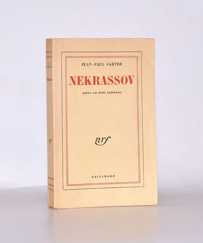 First edition in book form of the political play that Sartre himself called "" ""The Respectful Prostitute"" on the level of politics"" (Sartre, ""France-Observateur"", June 9, 1955), by other contemporaries called a ""crypto-communist"" work, or even worse ""a farce in eight tableaus"".Hors commerce-copy (marked ""H.C."") of the regular issue. The printing in book form was preceded by the appearance of it in ""les Temps modernes, no. 114-15, 116, & 117, June-September of 1955. ""Nekrassov"" is Sartre's response to the anti-communist sentiments found in the post-second world war era, personified in the American senator Joseph McCarthy. The play is a political comedy written in the form of a playwright that demonstrates the difficulty of maintaining personal freedom in a society obsessed with the threat of communism. The well esteemed critic wrote in his review of Nekrassov: ""[It] reveals him as the best comic talent of our times."" Almost none of the contemporary reviews from the critics of the center and rightist press were favourable, though. ""[A] certain grim rejoicing was apparent in the columns of these mourners as they celebrated the still-birth of ""Nekrassov""."" (Neal Oxenhandler, ""Nekrassov and the Critics, in: Yale French Studies, No. 16, 1955, p.8). Although ""Nekrassov"" has not been performed on the stage in Paris since 1955, in the literature to come, the play has achieved the role as one of the best pieces Sartre ever wrote. Contat & Rybalka: 55/265 - b)