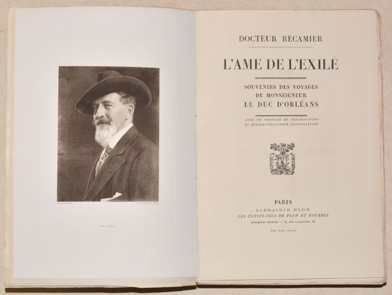 1927 Paris Plon 1927 [6] ,grand in8 broché 373 p. portrait en héliogravure en frontispie, illustré de 82 reproductions de photographies en noir grand in-8, Édition originale des souvenirs de chasse et d'exploration de Philippe, duc d'Orléans en Afrique de l'est, en Inde, en Arctique et en Espagne. Le docteur Récamier qui l'accompagna raconte tous ses voyages. Le duc d'Orléans fut un explorateur reconnu et un chasseur célèbre.