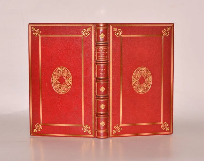 ÉDITION ORIGINALE de ce CÉLÈBRE TRAITÉ rédigé par l'imprimeur, philologue, helléniste et humaniste français Henri ESTIENNE (1528-1598). Si l'ouvrage s'adresse en premier lieu aux Italiens qui proclamaient la supériorité de leur langue et de leur littérature, il ne s'en prend pas moins aux latinistes qui condamnaient la langue vulgaire comme inapte à la fonction de langue littéraire. Cet ouvrage précieux fut rédigé en noins de trois mois et de mémoire par Henri Estienne, sur le vif désir qu'avait Henri III de voir paraître un travail de cette sorte ; il valut à son auteur une pension de mille livres et l'intimité du roi. La page de titre comporte la marque typographique de Robert Estienne : Mamert Patisson utilisait son atelier et son matériel depuis qu'il avait épousé sa veuve cinq ans auparavant. (De Backer, I-22 - En français dans le texte, 62 - Renouard, 181-3 - Brunet II, 1075). Des BIBLIOTHÈQUES Auguste GENARD (1819-1908), collectionneur et maître gantier à Grenoble puis d'Henry HOUSSAYE (1848-1911), historien, critique d'art et critique littéraire français. TRÈS BEL EXEMPLAIRE conservé dans une reliure en maroquin décorée de LORTIC. NICE COPY. PICTURES AND MORE DETAILS ON REQUEST.